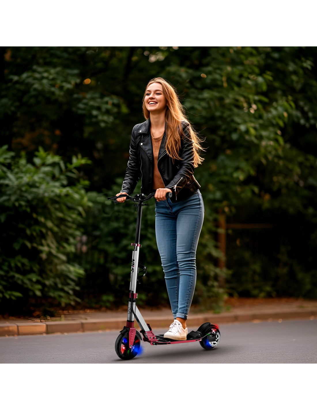 Dank der Verwendung großer Polyurethanräder mit einem Durchmesser von 200 mm und hochwertiger ABEC 7-Lager bietet der Roller eine extrem sanfte Fahrt. Er funktioniert perfekt auf Asphalt und gepflasterten Gehwegen, garantiert Komfort und minimiert Vibrationen auch auf unebenen Oberflächen.