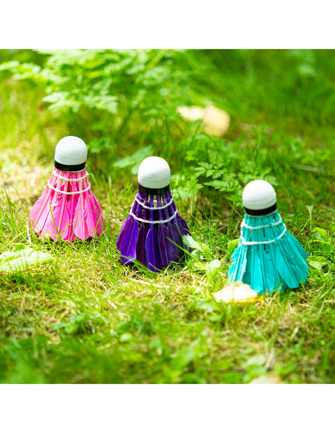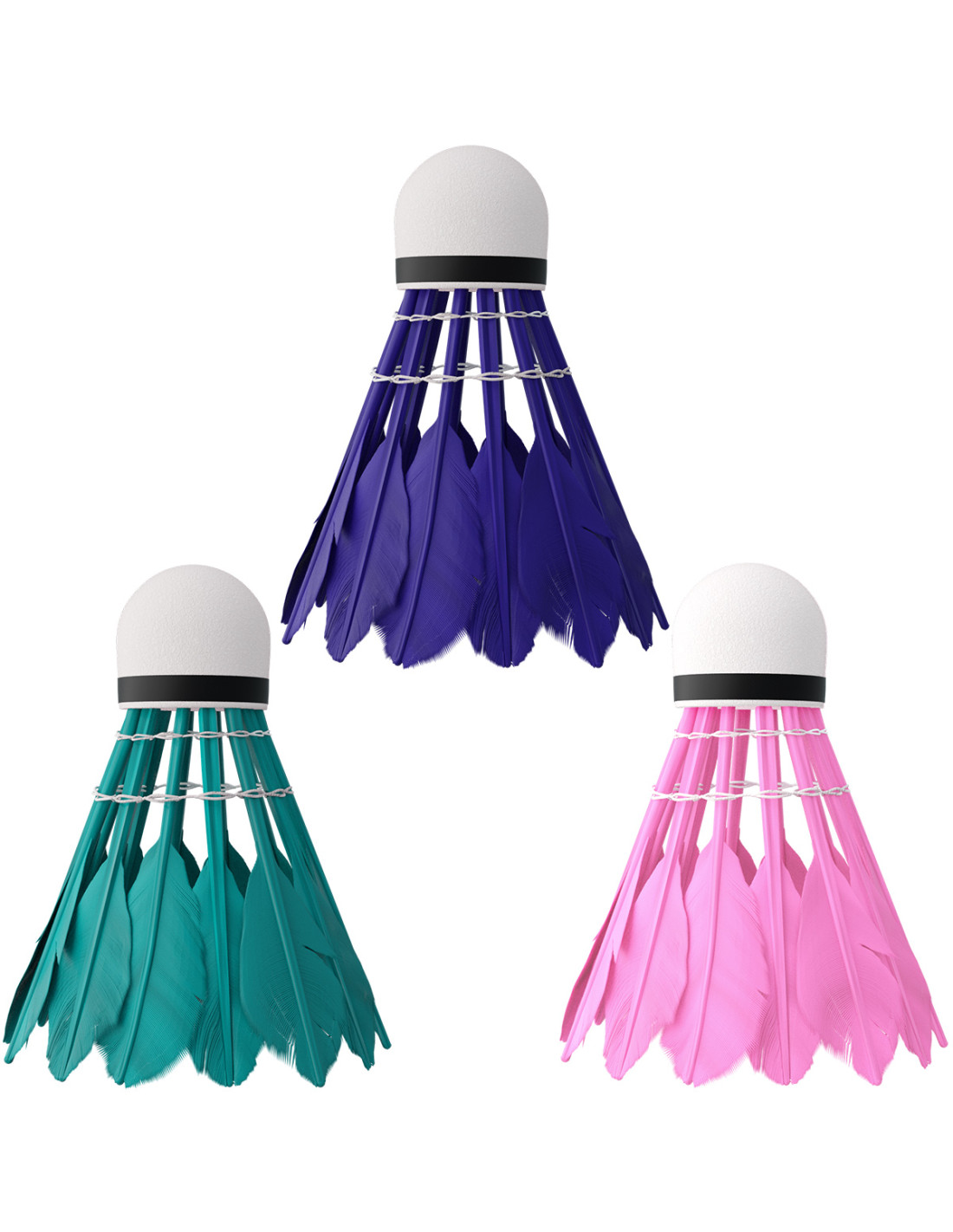 Die synthetischen Federbälle mit Kopf aus EVA-Stoff. Der synthetische Korb aus PVC beeinflusst direkt hohe Widerstandsfähigkeit des Federballs und gewährleistet seine Langlebigkeit im Vergleich mit einem Federball aus Entenfedern.