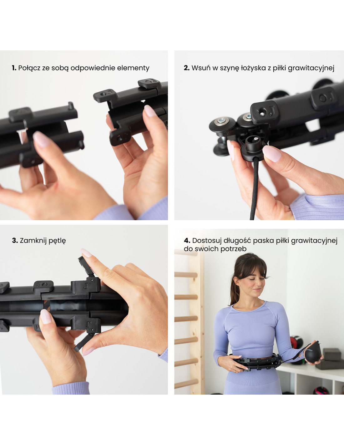 Der Reifen kann man durch Knopfdruck der Clip-Verschlüsse mit Magneten öffnen. Die Massagenoppen müssen in die Löcher richtig eingeführt werden. Beim Entfernen der Elemente braucht man nur ein ausgewähltes Element zu greifen und es zu drücken. Man kann dann die Massagenoppen aus den Löchern herausnehmen. Man schiebt danach die Schiene mit dem Schwerkraftball, schließt die Clip-Verschlüsse und passt die Seillänge an. Fertig. Dank den geringen Abmessungen ist das Produkt einfach zu transportieren. Man kann es überall mitnehmen.