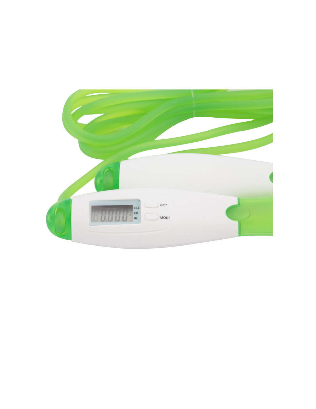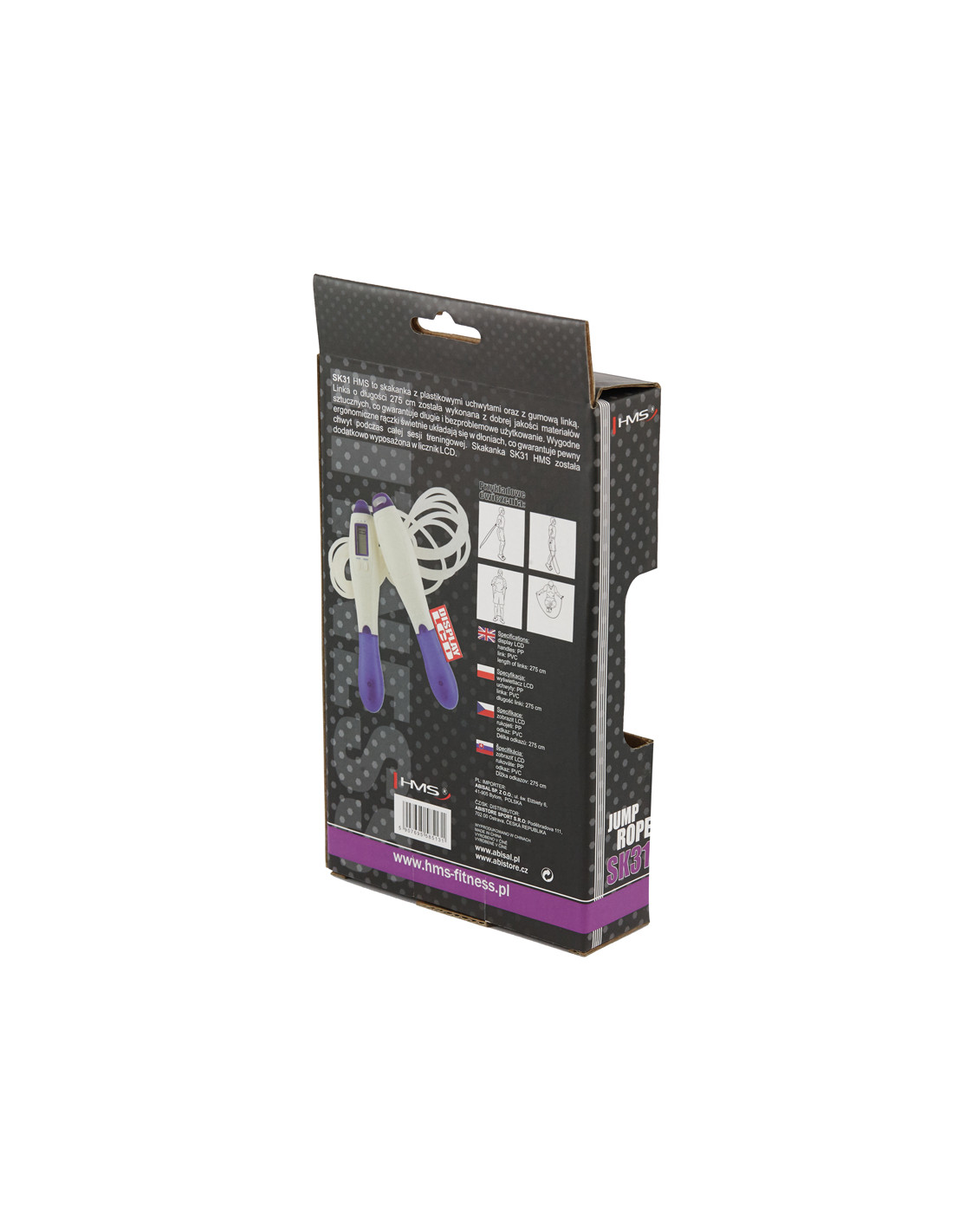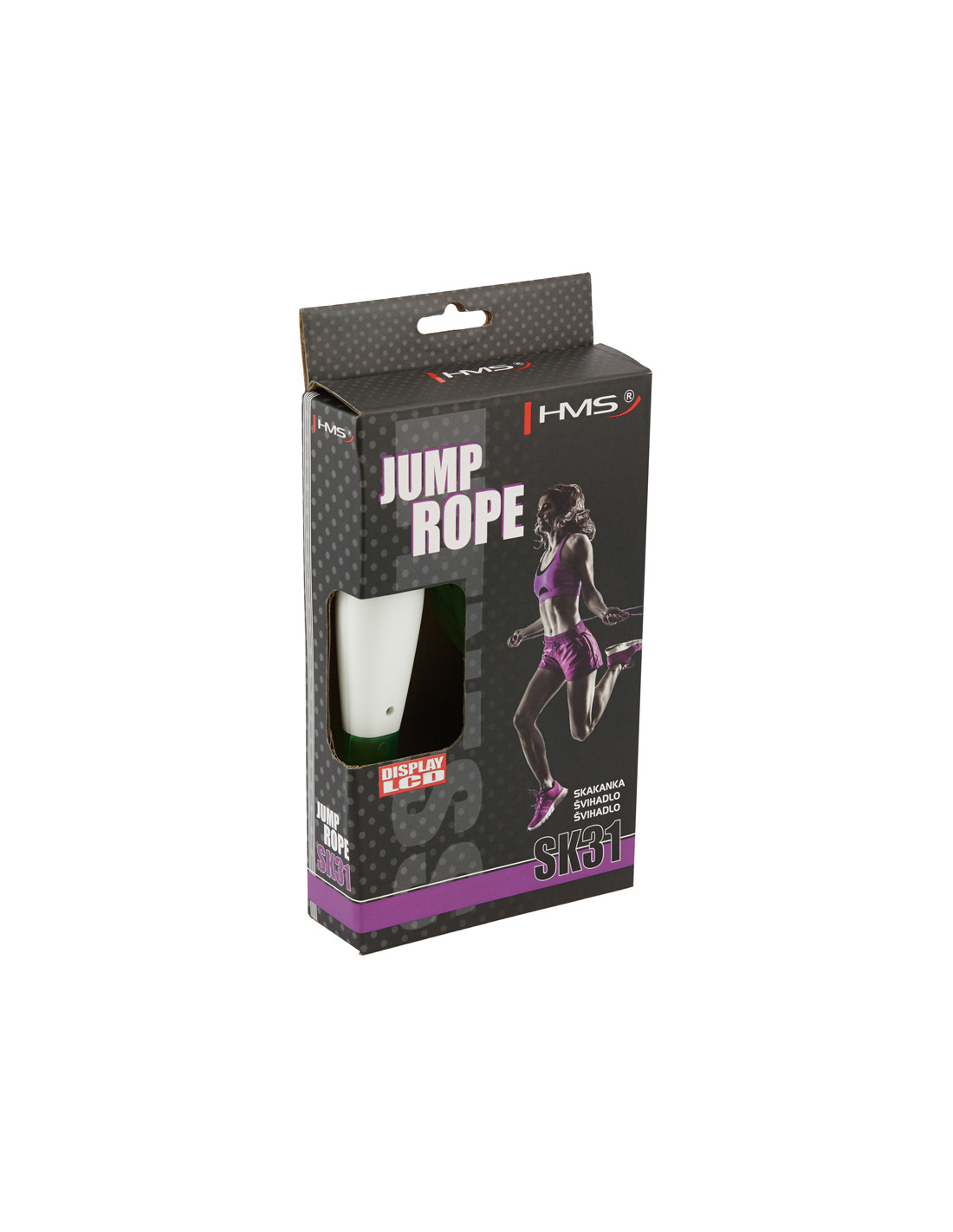 Das SK31 HMS Springseil ist ein Springseil mit dem Gummiseil und zwei Griffen, die aus Kunststoffen hergestellt wurden. Das Produkt wurde zusätzlich mit elektronischem Zähler mit LCD-Bildschirm ausgestattet, der über drei Funktionen, nämlich Kalorienverbrauch, Distanz und Anzahl der Wiederholungen, verfügt.
