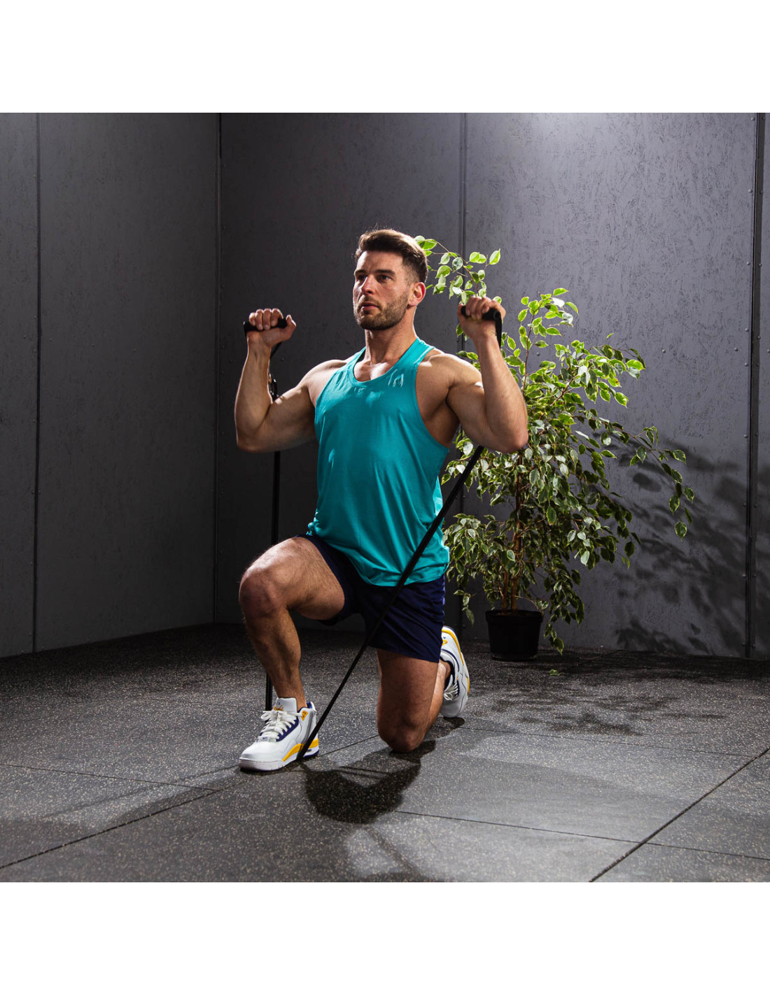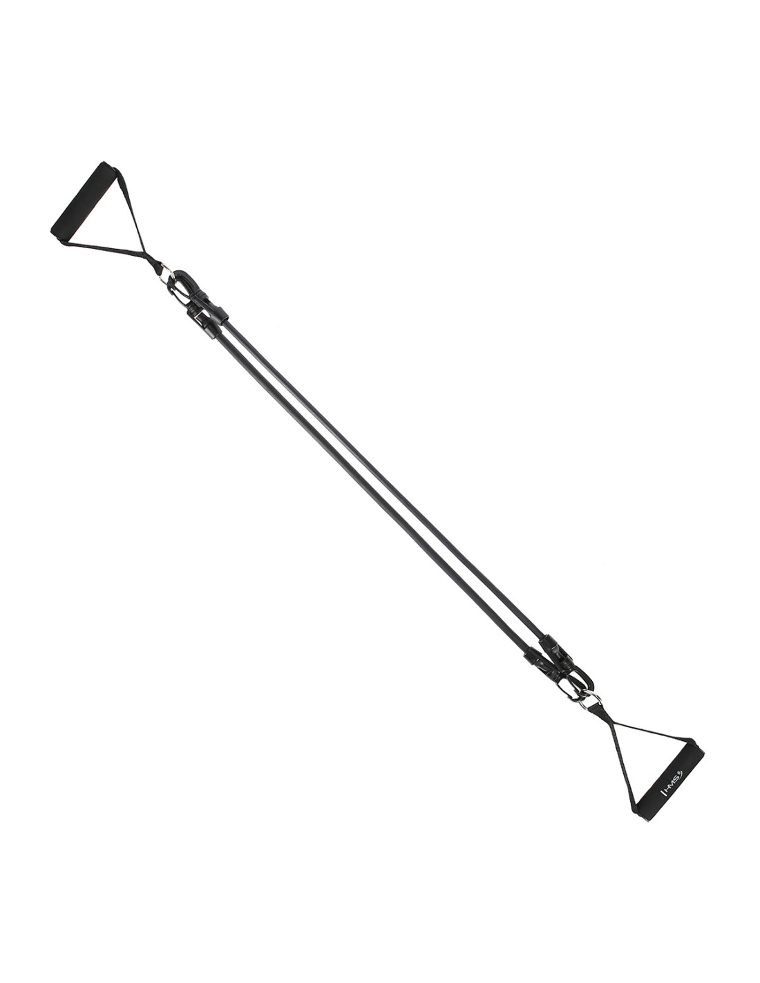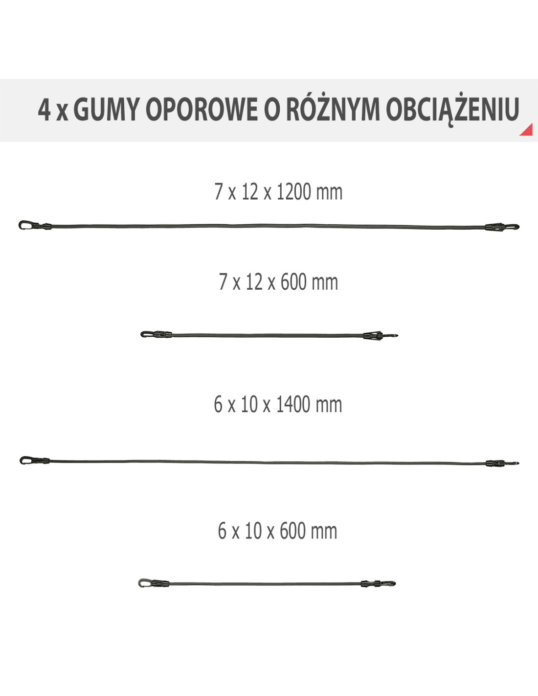 TX02 HMS - ist ein Übungsset. Das Produkt nutzt das Körpergewicht des Benutzers, um seine Fitness und Kraft zu verbessern. Hohe Qualität, durchdachtes Design und Langlebigkeit garantieren ein erfolgreiches Training unter allen Bedingungen. Das Set enthält vier Widerstandsbänder, ein Gummiband, ein Widerstandsband, zwei Schaumstoff-Handgriffe, einen Knöchelgriff, einen Türgriff und ein Springseil. Das Gerät ist eine Möglichkeit, ein modernes Training im Sinne des Cross-Trainings zu absolvieren. Jedes Kabelzugpaar hat eine andere Steifigkeit, sodass Sie die Intensität des Widerstandstrainings variieren können. An jedem Kabelzug befindet sich ein Griff, sodass ein umfassendes Krafttraining aller Muskelgruppen möglich ist.