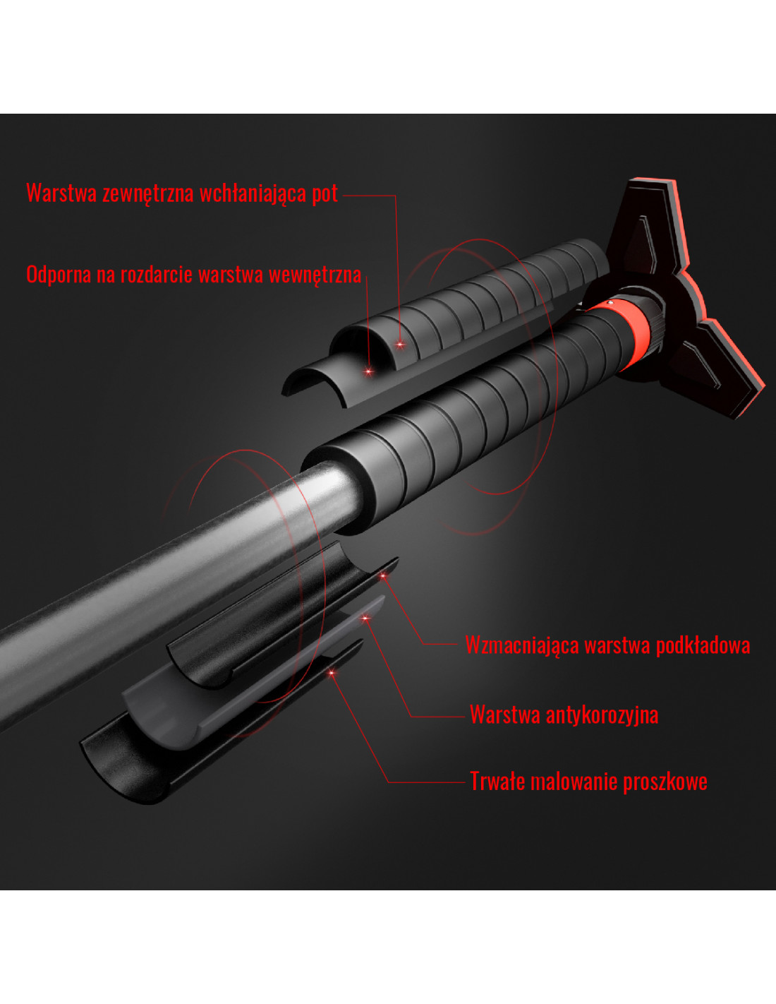 Die Griffe sind mit einem speziellen Material bedeckt, das Schweiß aufnimmt und ein Abrutschen der Hände verhindert. Zusätzlich ist das Produkt kratzfest, dank einer Grundschicht, Korrosionsschutz und dauerhafter Pulverbeschichtung.