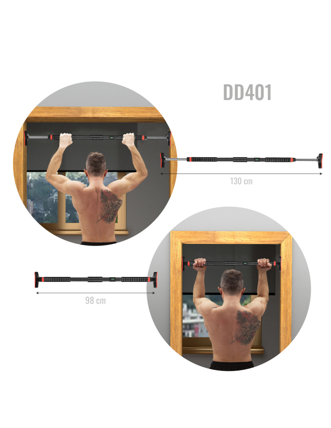 DD401 ist verstellbar im Bereich von 98-130 cm, so dass es an verschiedene Türtypen angepasst werden kann. Die Montage ist sehr einfach und erfordert keine speziellen Werkzeuge, Die Stange hat einen eingebauten Steckschlüssel, die Stange ist auch einfach zu verstauen und zu transportieren, was sie zu einer idealen Wahl für diejenigen macht, die zu Hause oder unterwegs trainieren möchten.