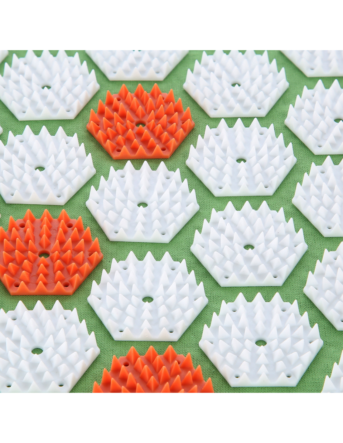 Die Matte hat sogar 8640 Akupressur-Spitzen aus Kunststoff, was derselben Zahl der Druckpunkte entspricht. Die Akupressur-Spitzen befinden sich auf speziell profilierten Nagelkreisen. Die große Zahl und die entsprechende Dichte dieser Spitzen tragen dazu bei, dass Sie einen optimalen Druck erreichen.