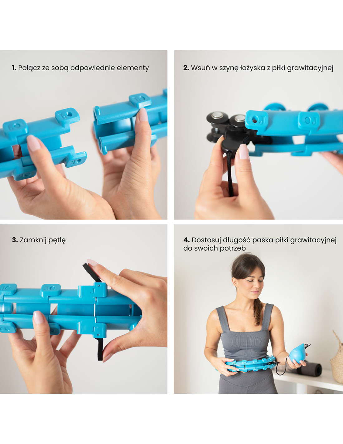 Der Reifen kann man durch Knopfdruck öffnen. Um weitere Elemente zu verbinden, braucht man ein Element in ein anderes Element einstecken. Die Massagenoppen müssen in die Löcher richtig eingeführt werden. Beim Entfernen der Elemente braucht man nur ein ausgewähltes Element zu greifen und es zu drücken. Man kann dann die Massagenoppen aus den Löchern herausnehmen. Man schiebt danach die Schiene mit dem Schwerkraftball, schließt die Clip-Verschlüsse und passt die Seillänge an. Fertig.