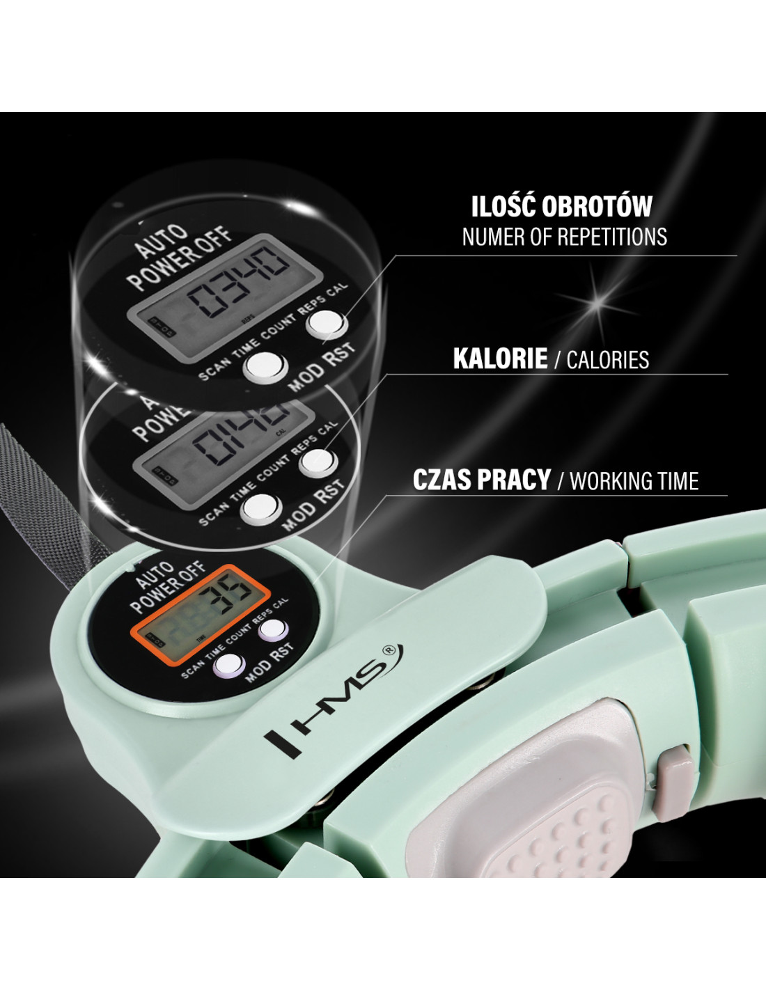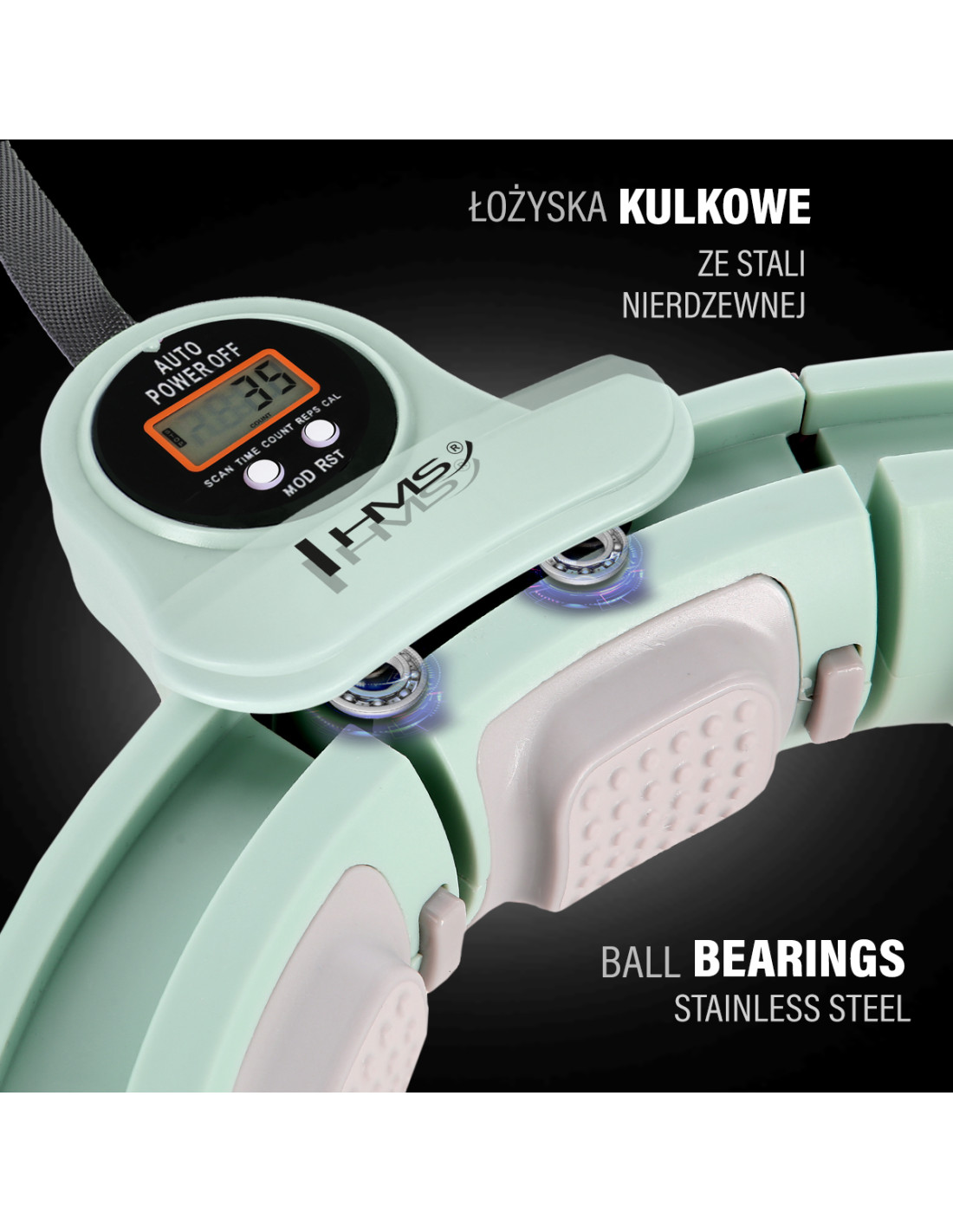Die Konstruktion des Hula-Hoop-Reifens von HMS ist aus hochwertigen Materialien gefertigt. Die richtige Auswahl der besten Komponenten wird Ihnen volle Zufriedenheit garantieren und der eingebaute Zähler ermöglicht es Ihnen, die verbrannten Kalorien, die Anzahl der Umdrehungen und die Trainingsdauer zu überprüfen. Die Bewegung ist flexibel und angenehm für den Körper. Der mit Sand gefüllte Schwerkraftball garantiert die Sicherheit sowohl für den Benutzer als auch für den Ort, an dem Sie trainieren.