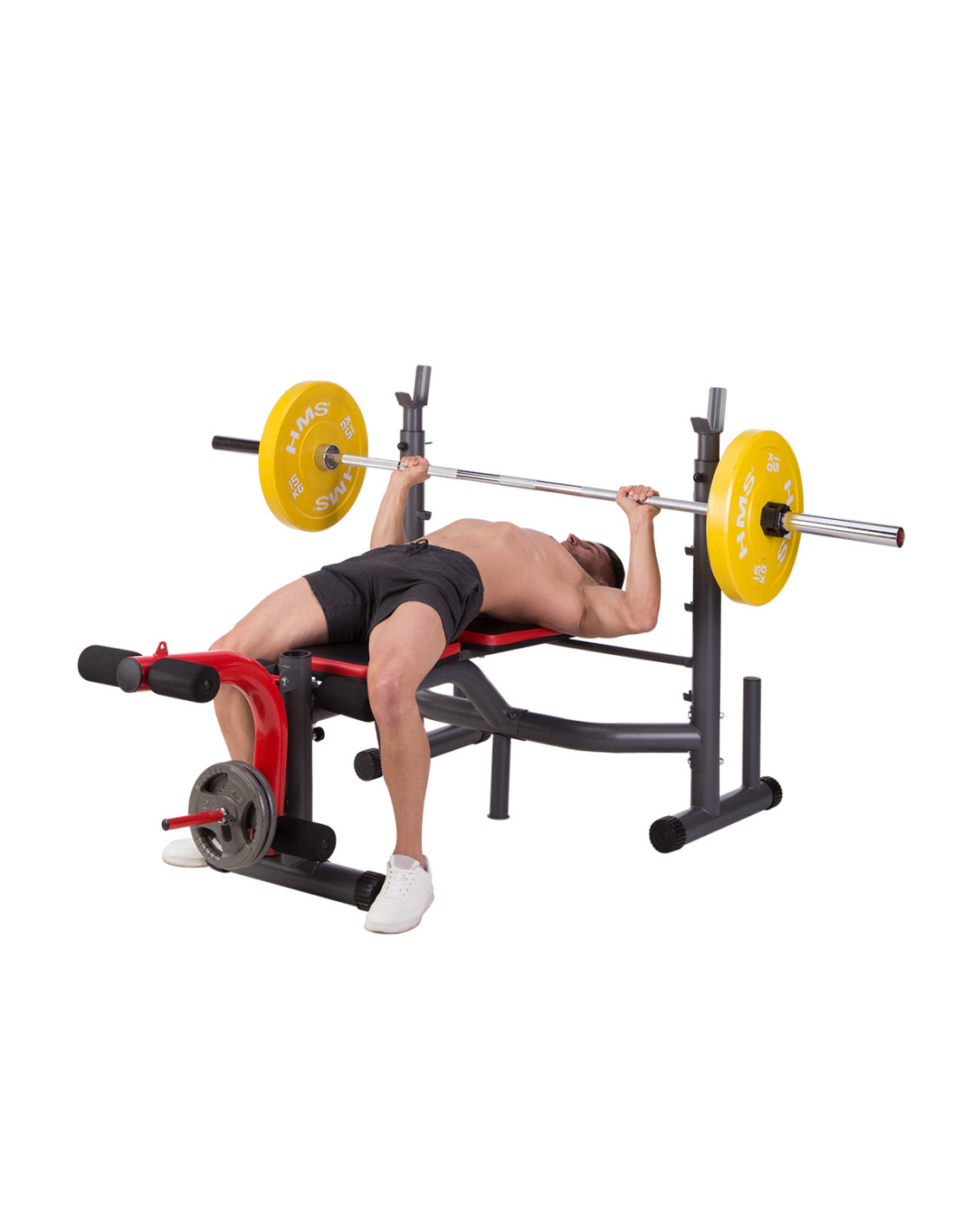LS7206 HMS ist eine Bank mit Curlpult, Beinpresse und Latzug, die für das Training mit Lang-, Kurzhanteln und Hantelscheiben konzipiert ist.
