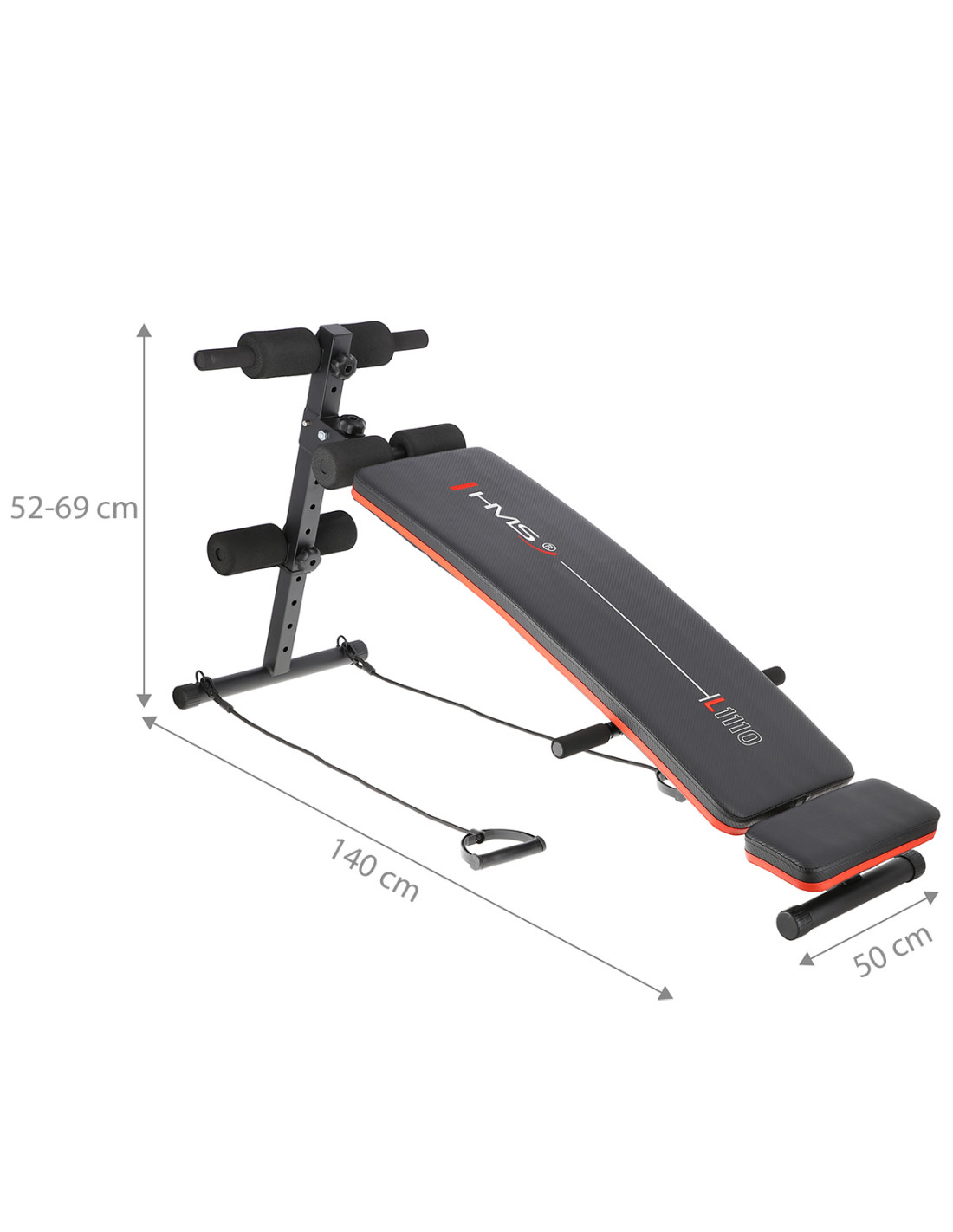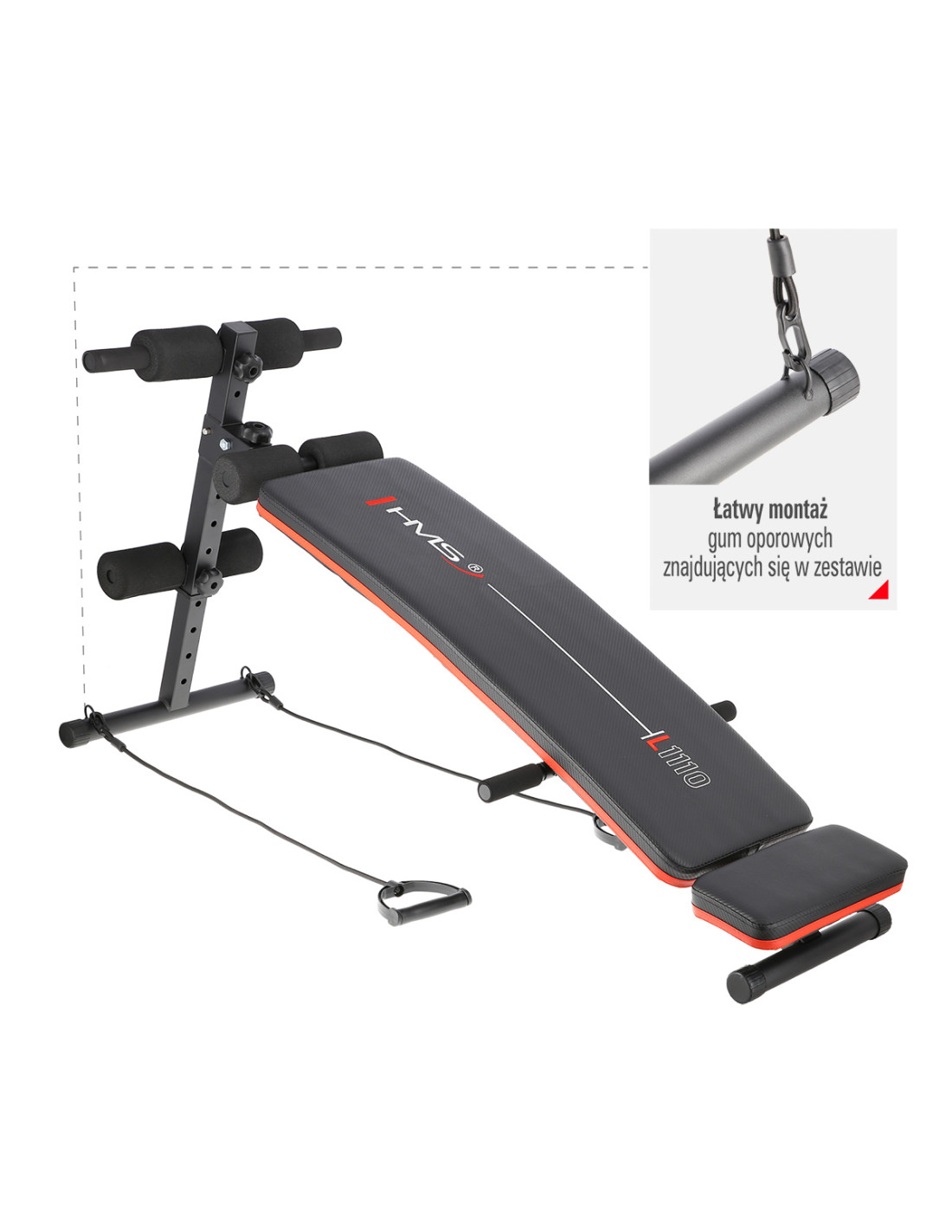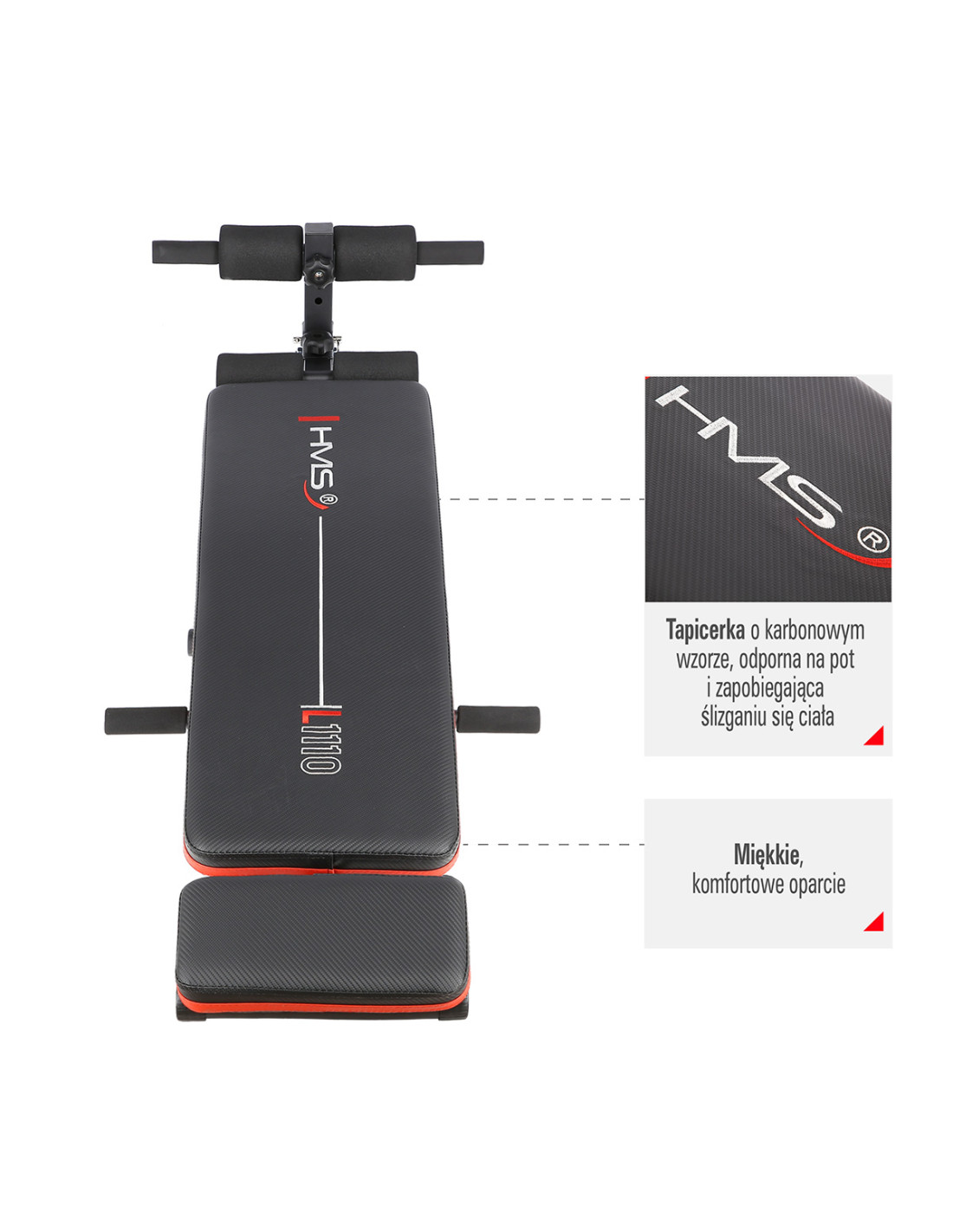 Die Trainingsbank L1110 HMS steht nicht nur für die Stabilität, sondern auch für den Komfort. Der weiche Schaumstoff auf der Rückenlehne und die Schaumstoff-Elemente auf den Liegestützgriffen gewährleisten den Komfort während des gesamten Trainings. Die Polsterung mit Karbon-Muster ist nicht nur stilvoll, sondern auch schweißfest und verhindert das Abrutschen des Körpers beim Training. Die Verstellung des Neigungswinkels ermöglicht es, einfach und problemlos die Schwierigkeit einer Übung an Bedürfnisse der Nutzer anzupassen. Je höher der Neigungswinkel ist, desto mehr intensiver ist die Übung. Im Lieferumfang sind auch Widerstandsbänder enthalten, die sich an einem dafür vorgesehenen Platz befestigen lassen. Dadurch wird das Training abwechslungsreicher. Die Widerstandsbänder gewährleisten eine große Palette der Übungen, die man mit diesem Produkt machen kann.