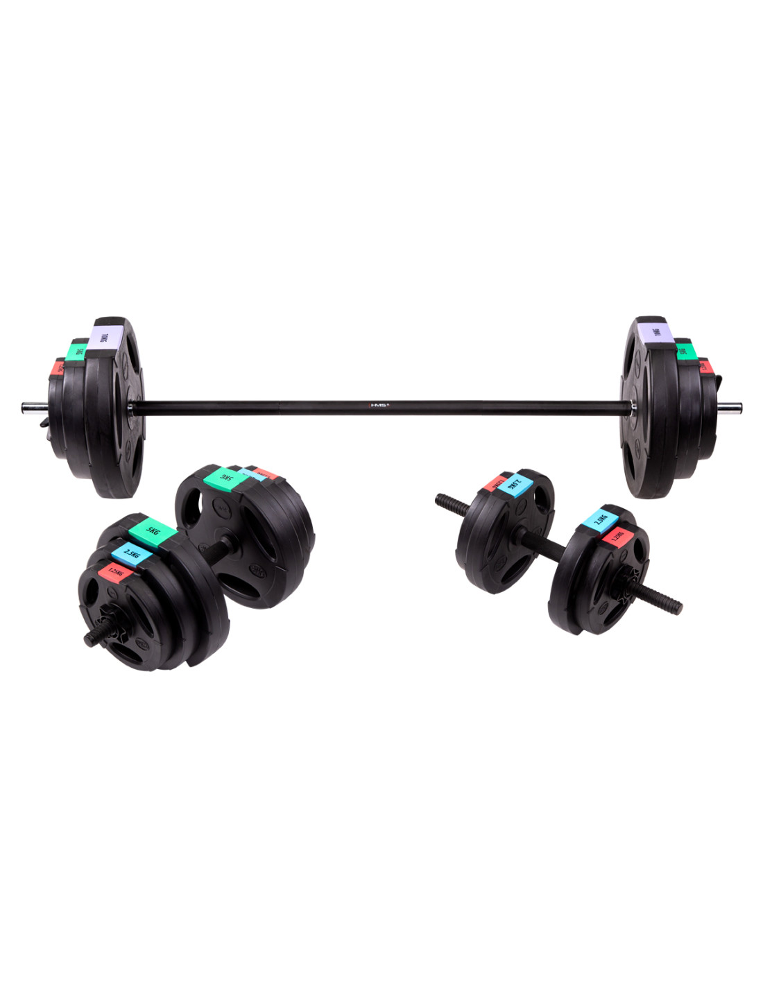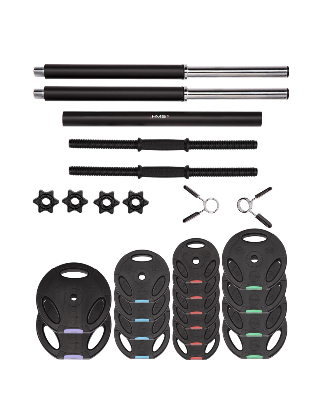 Mit der idealen Lösung kommt die HMS-Marke, die Ihnen das Produkt SGSP60 anbietet, d.h. ein Set aus Verbundstoff-Kurzhanteln und einer Langhantel samt Hantelscheiben.