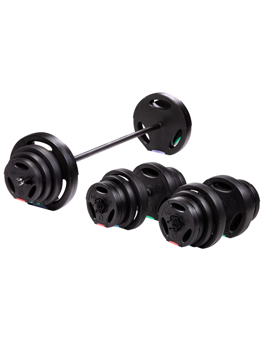 - Anzahl der Hantelstangen im Set: 1 x Langhantel / 2 x Kurzhanteln