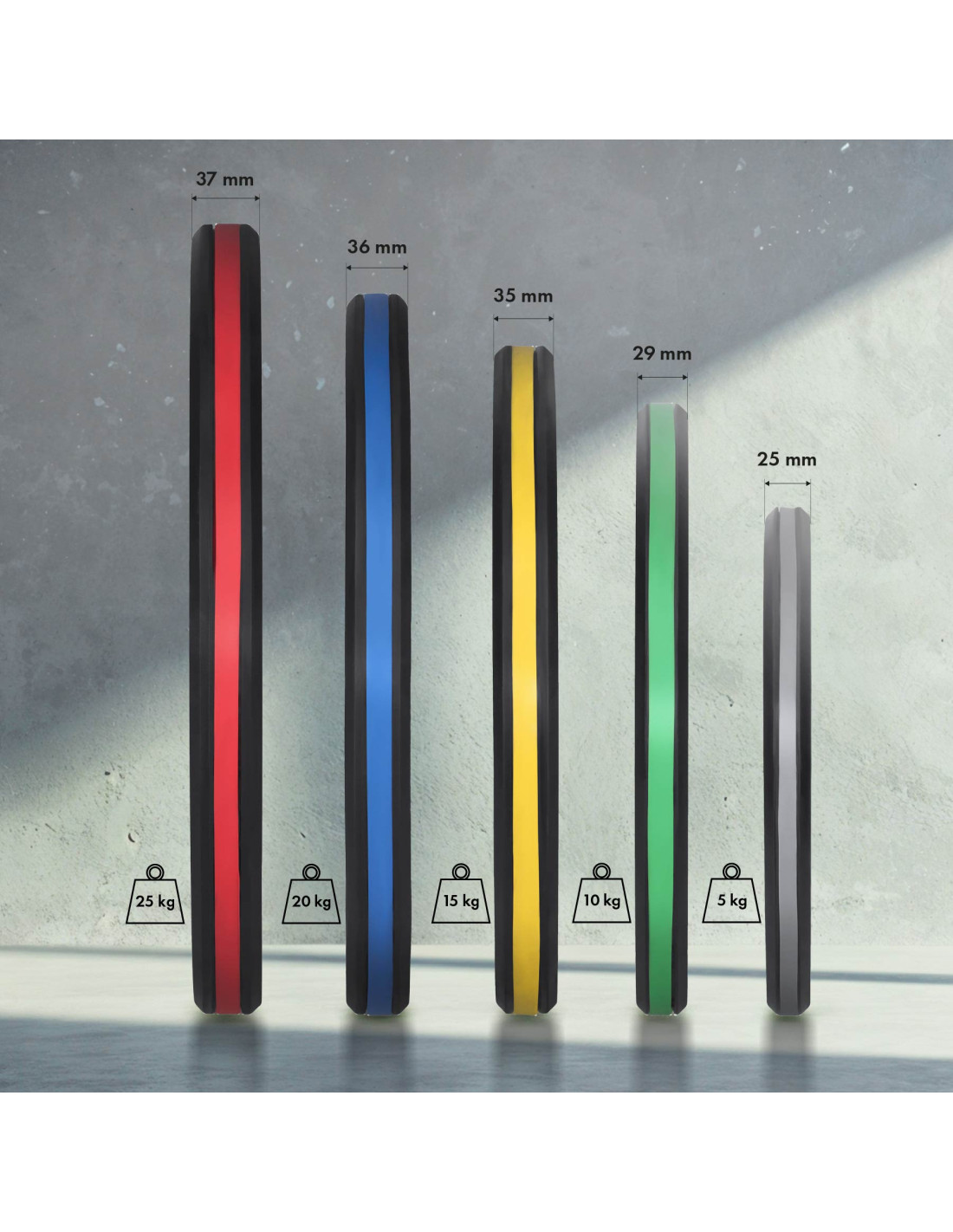 TOG-Platten sind in fünf Gewichten erhältlich: 5 kg (grau), 10 kg (grün), 15 kg (gelb), 20 kg (blau) und 25 kg (rot). Eindeutige Gewichtsmarkierungen und Farben, die internationalen Standards entsprechen, erleichtern die schnelle Auswahl der richtigen Last während des Trainings.