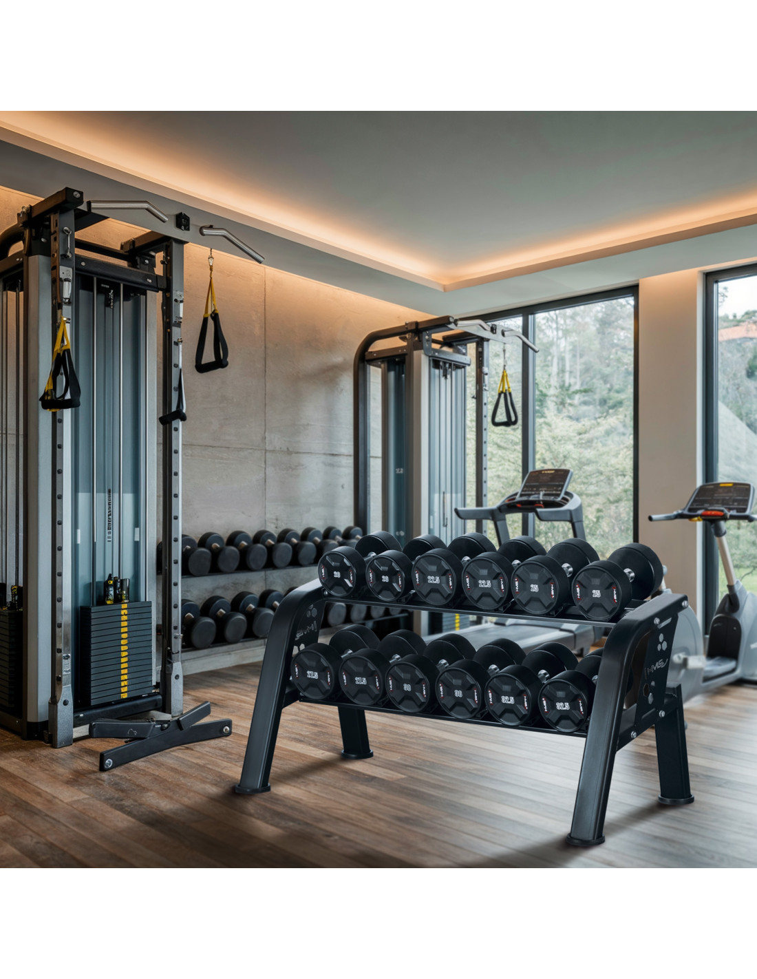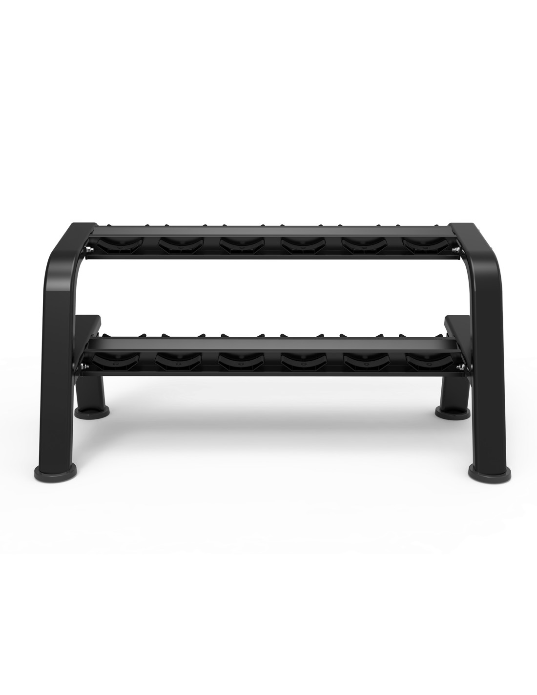 STR48 ist ein robuster und gut durchdachter Doppelstockständer, der bis zu 12 Hanteln aufnehmen kann. Dank seiner erhöhten Kapazität und stabilen Konstruktion eignet er sich sowohl für Fitnessclubs als auch für Heimtrainingsbereiche.