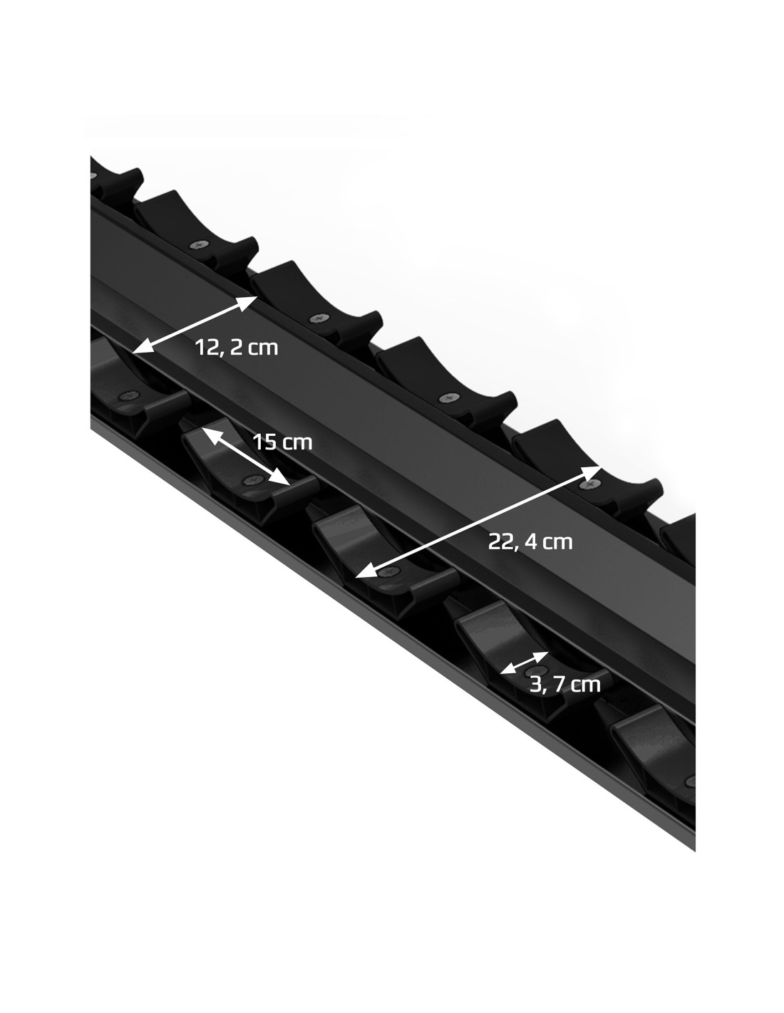Der STR48 verfügt über zwei geräumige Ablagen, die mehr als die klassischen Lösungen aufnehmen können – bis zu 12 Hanteln. Die leicht geneigten Oberflächen erleichtern das Greifen der Geräte und vermeiden eine übermäßige Beugung der Handgelenke, was den Komfort erhöht und die Gelenke während des Gebrauchs schont.