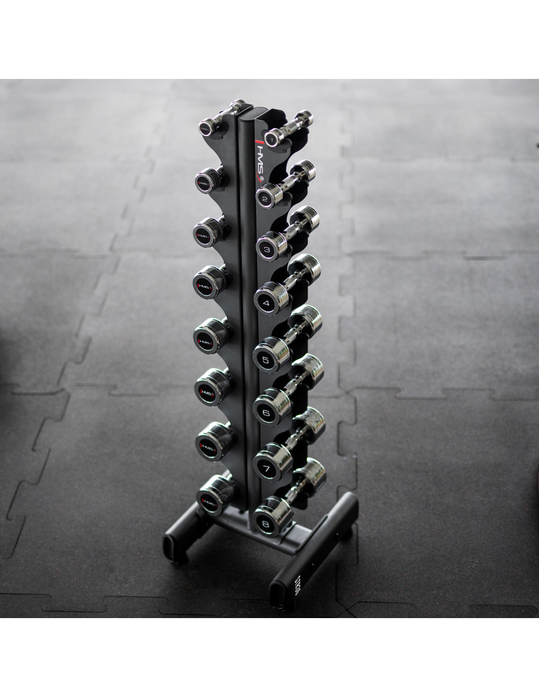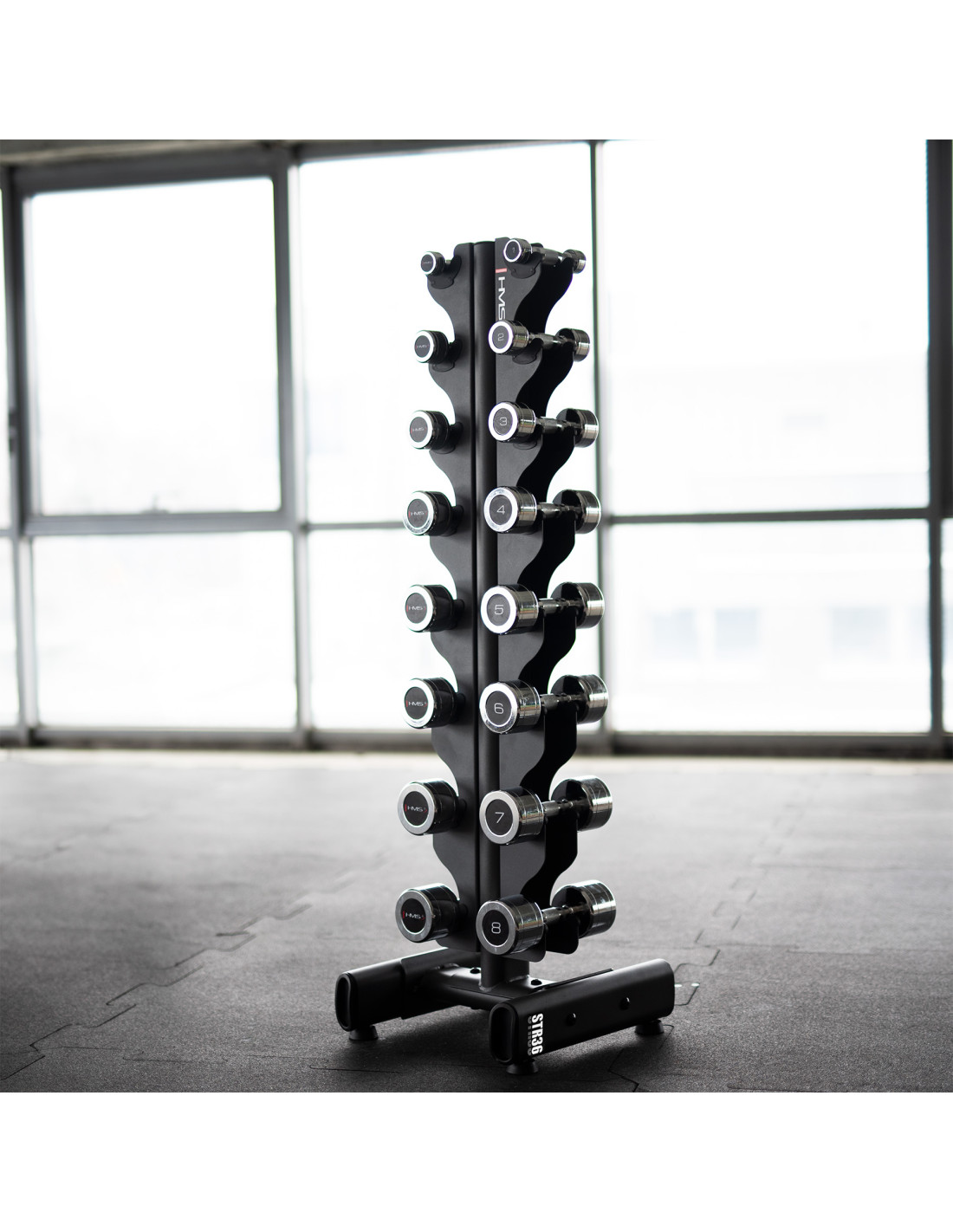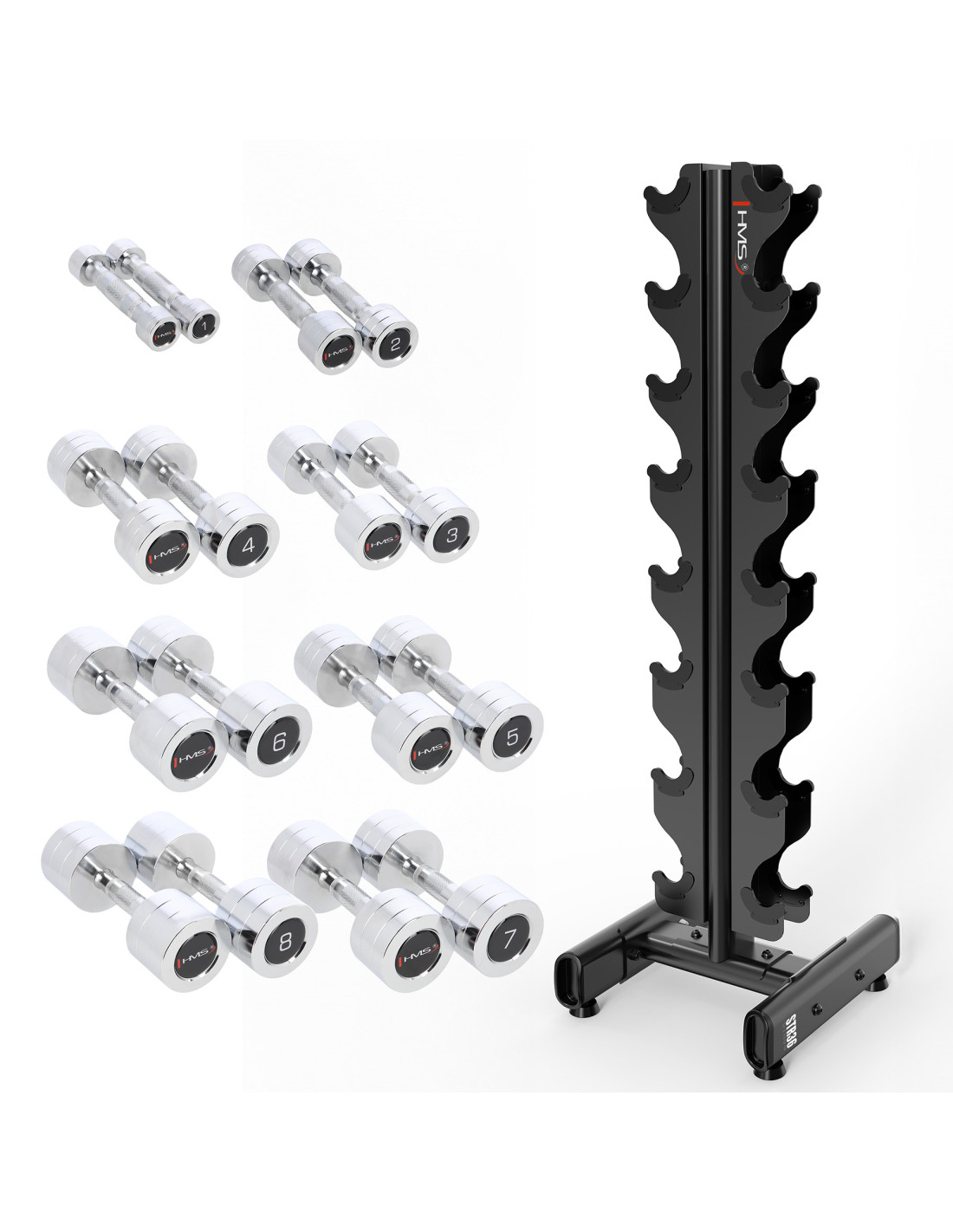 Das HMS-Set CHD-Hanteln in Kombination mit dem STR36-Ständer ist die perfekte Lösung für alle, die elegante, funktionale und kompakte Krafttrainingsgeräte suchen. Das Set enthält Hanteln von 1 bis 8 kg, die paarweise verkauft werden und perfekt zum vertikalen STR36-Ständer passen.