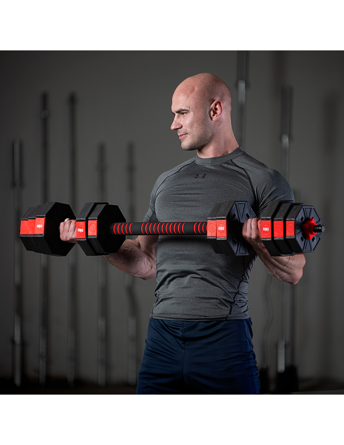 Mit dem speziellen Verbindungselement bekommen Sie die Möglichkeit der Zusammensetzung beider Kurzhanteln in eine Langhantel. Das ist eine innovative Lösung, die bedeutend das Spektrum der Übungsmöglichkeiten erweitert. Das liegt daran, dass Sie eine Langhantel erhalten, mit der Sie Übungen durchführen werden, die mit Hantelstangen unmöglich oder nicht bequem auszuführen sind. Wenn man sich für dieses Produkt entscheidet, bekommt man eigentlich zwei Produkte.