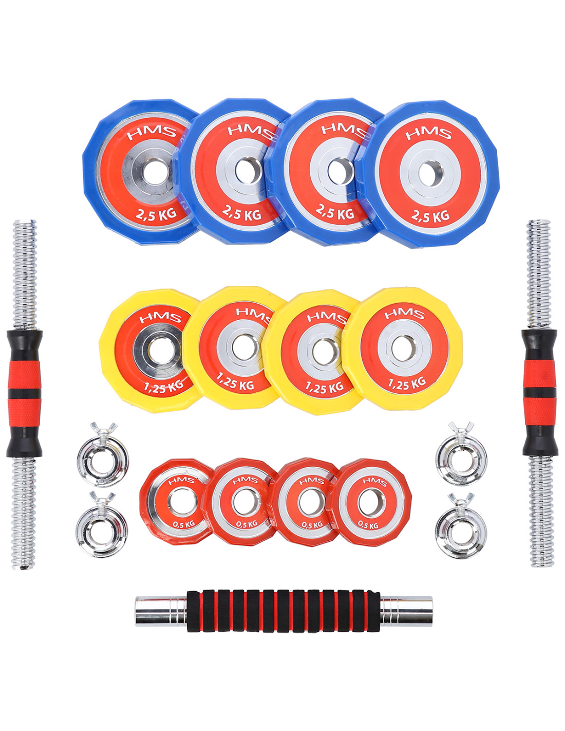 Die Kurzhanteln mit austauschbaren Hantelscheiben gehören zu einem klassischen und unbedingten Element jedes Heim-Fitnessstudios. Dieses Set SKC20 HMS soll in Ihrem Fitnessstudio nicht fehlen, d.h. das Set mit zwei Kurzhanteln aus verchromtem Stahl. Sie können diese Kurzhanteln verbinden und im Endeffekt bekommen Sie eine Langhantel.
