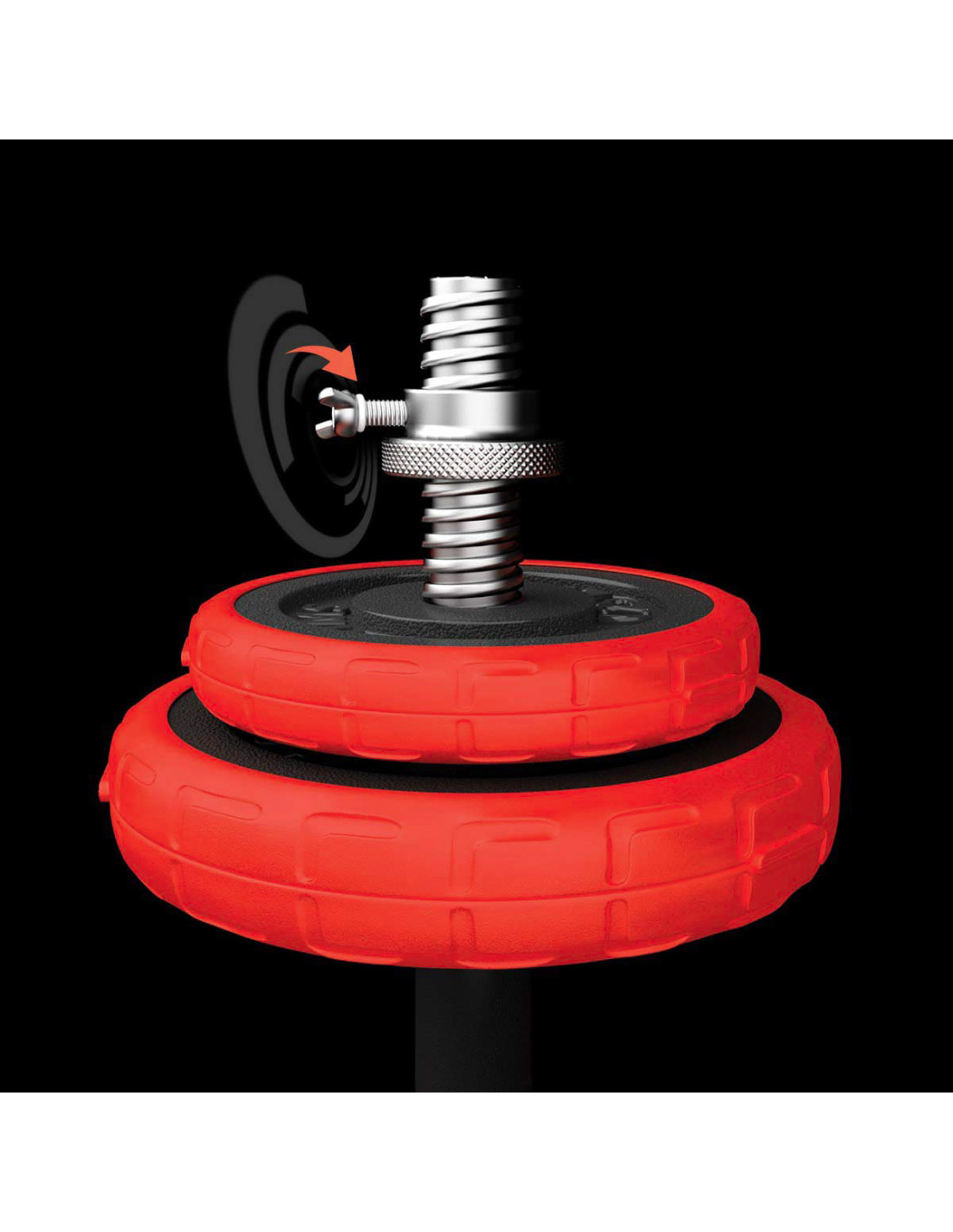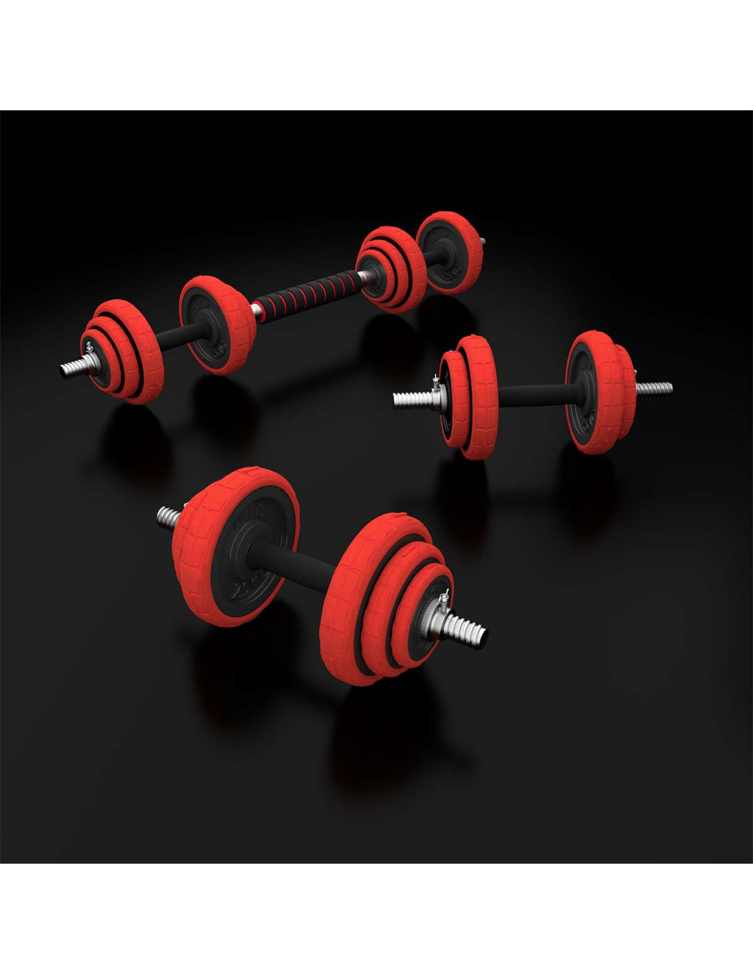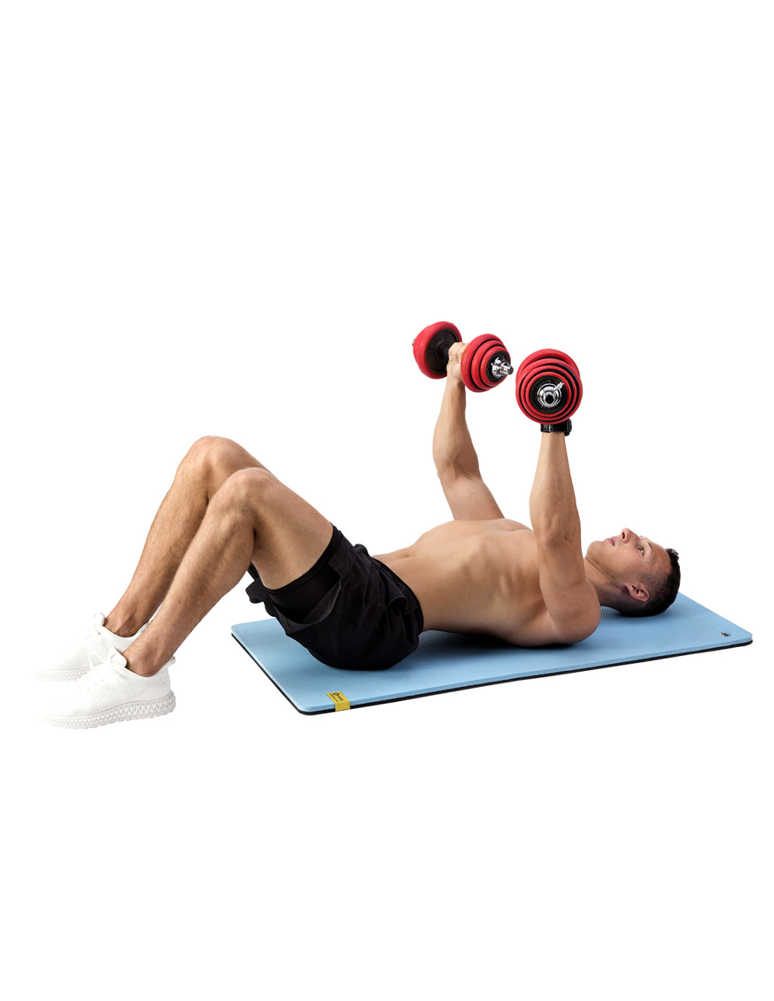 Auf den Handgriffen der Kurzhanteln gibt es auch Gummi, das für ein sicheres und bequemes Greifen sorgt. Das Verbindungselement, mit dem man die Langhantel montieren kann, ist mit Schaumstoff bedeckt. Dies ist z. B. bei den Kniebeugen sehr nützlich, weil während der Ausführung kein unangenehmer Druck auf den Nacken ausgeübt wird.