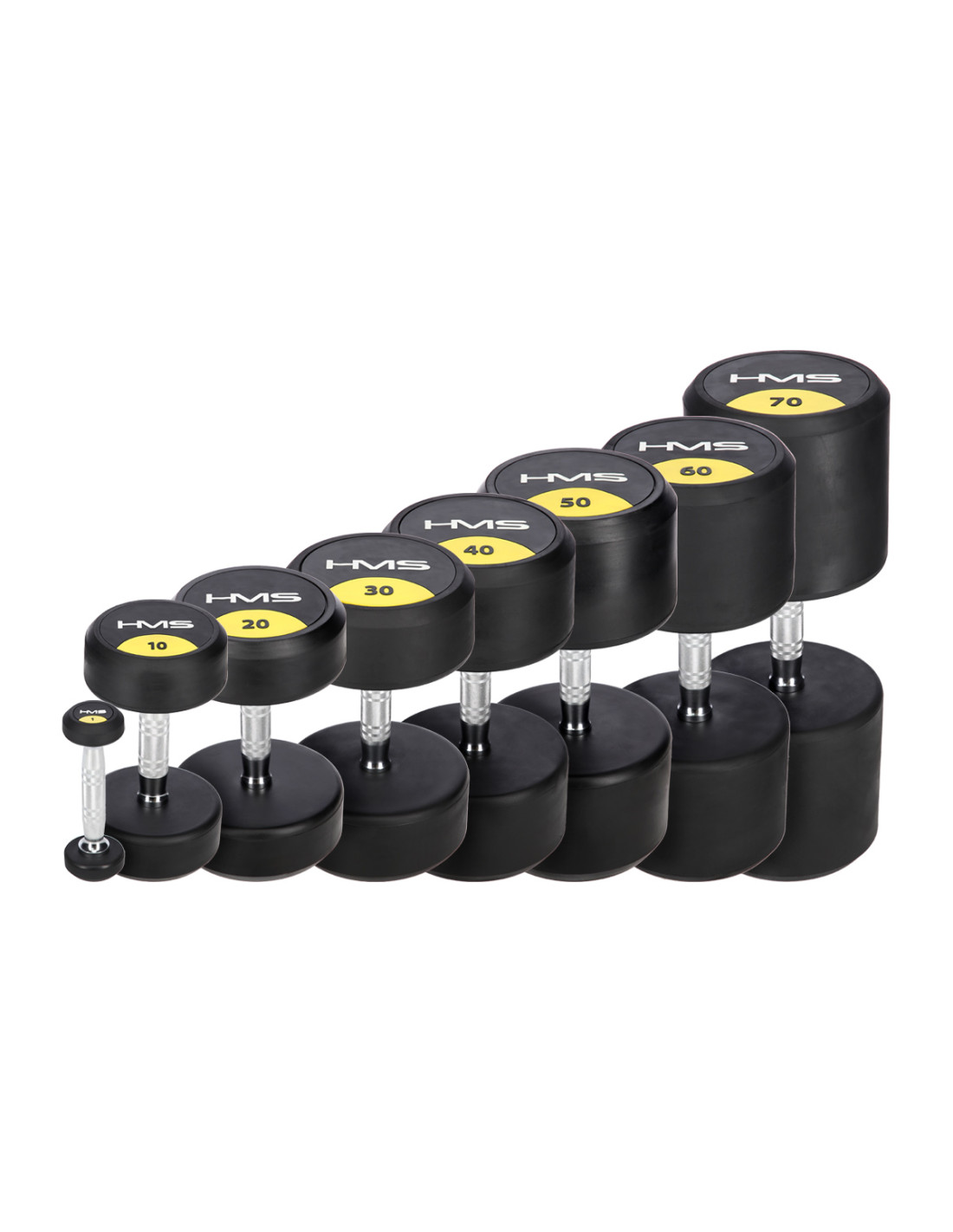 Das Training mit Handhanteln ermöglicht es, mehr Muskelgruppen zu aktivieren. Was damit zusammenhängt, kann man bessere Ergebnisse erreichen. Das Training mit den HG PRO Rundhanteln aktiviert unsere Stabilisierungsmuskeln und tiefe Muskelgruppen bei einigen Übungen. Ihre Form gibt uns die Möglichkeit, viele Arten der Übungen durchzuführen. Der profilierte, präzise gerändelte Handgriff verhindert, dass er aus der Hand verrutschen kann. Er garantiert auch ein sicheres Greifen. Die Gummiummantelung dämpft den Lärm und schützt den Boden vor Beschädigungen. Die HG PRO HMS Rundhantel ist in vielen Gewichten erhältlich und dadurch ist sie eine ideale Idee sowohl für Personen, die erst ihr Abenteuer mit dem Krafttraining anfangen, als auch für diejenigen, die Fortgeschrittene sind. Die hochwertigsten Stoffe und alle von Konstrukteuren durchdachte, genau hergestellte Elemente tragen dazu bei, dass diese Rundhantel Ihnen sehr lange beim Training begleiten werden.
