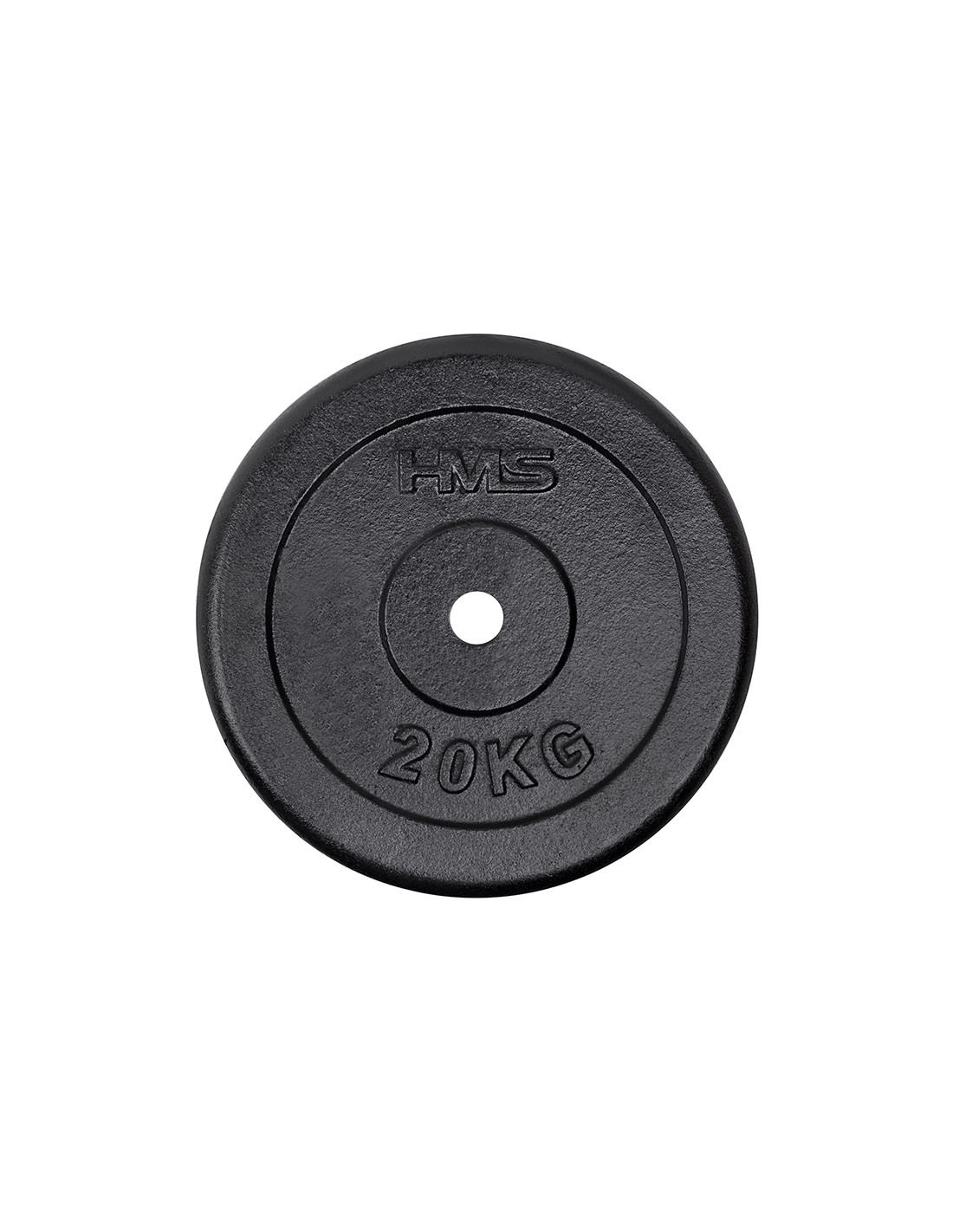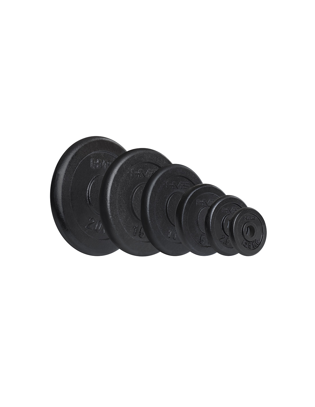 Die schwarze HMS Hantelscheibe ist in folgenden Varianten erhältlich: 1,25 kg, 2,5 kg, 5 kg, 10 kg, 15kg, 20 kg.