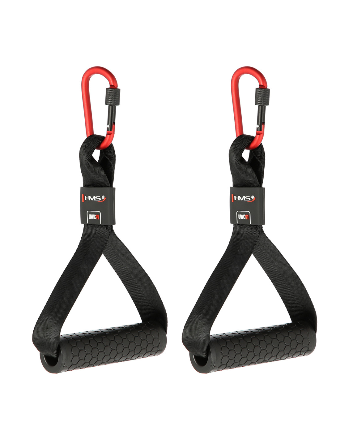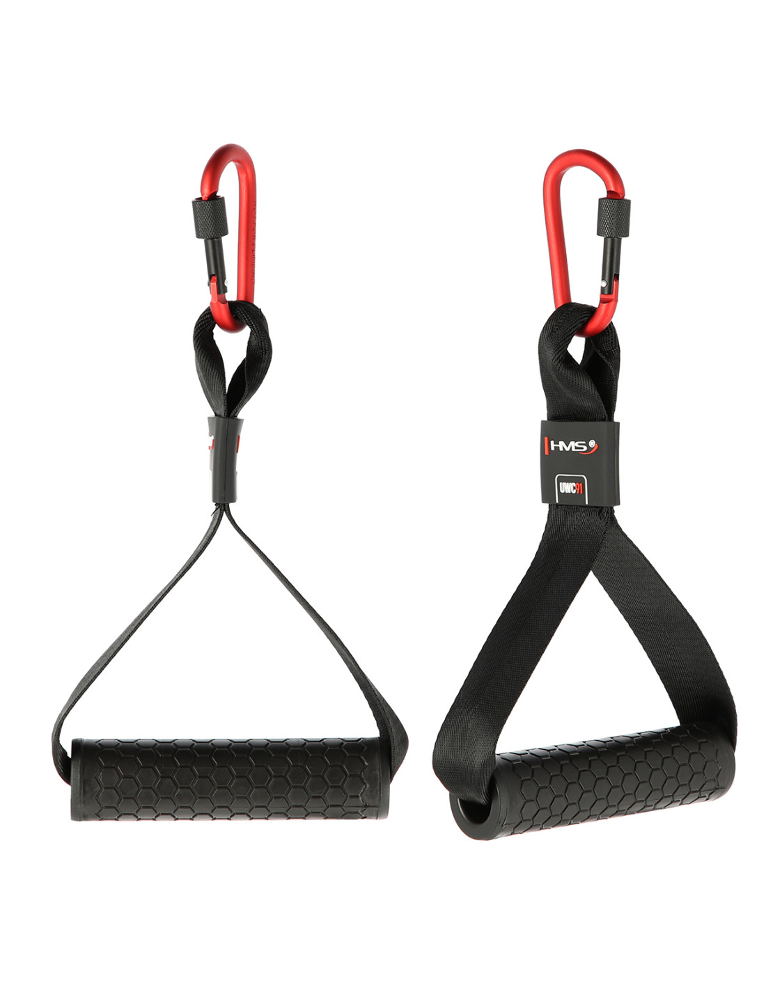 Die doppelten UWC91 HMS Einhandgriffe sind für Trainings mit Kabel- und Latzugstation oder zur Befestigung der Trainingsbänder geeignet. Man kann sie bei unterschiedlichen Übungsarten der verschiedenen oberen Muskelgruppen nutzen, angefangen von kleinen Muskelgruppen (wie Bizeps oder Trizeps), durch Deltamuskeln bis Rücken- und Brustmuskeln.