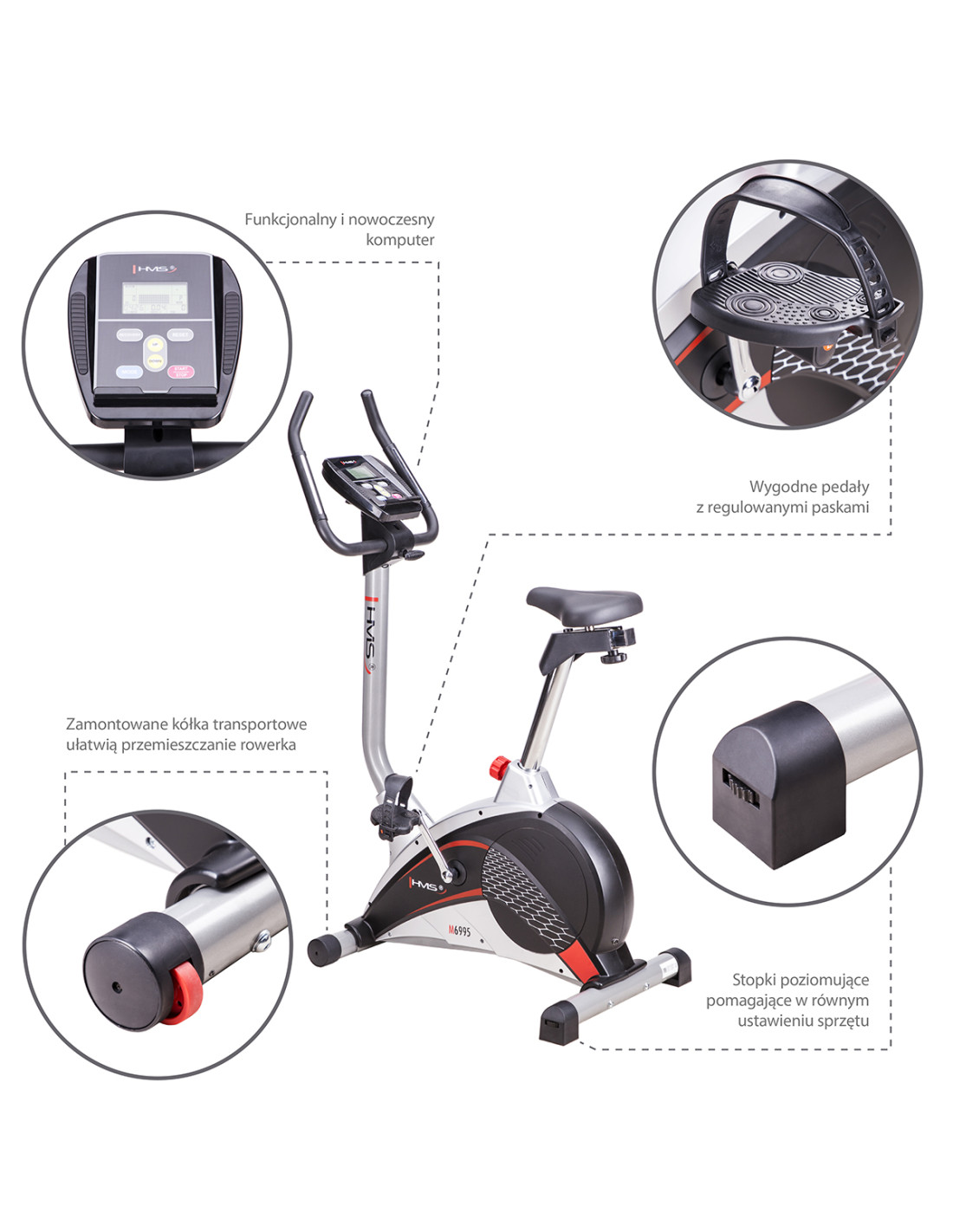 Der magnetische Heimtrainer M6995 HMS ist eine solide und stabile Konstruktion. Die Fußkappen zur Höhenverstellung werden Ihnen helfen, dieses Sportgerät problemlos aufzustellen. Der Transport des Heimtrainers wird mit den eingebauten Transporträdern einfacher. Der verstellbare Sattel sowie die bequemen Pedale mit den verstellbaren Riemen gehören zu den weiteren Vorteilen der besonders gelungenen Konstruktion.