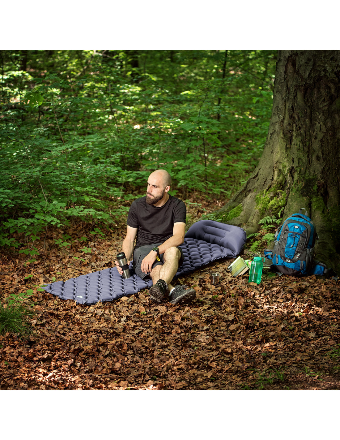 Die zusammengerollte Matte ist sehr platzsparend und die Methode des Zusammenrollens ist sehr einfach. Schrauben Sie das Ventil ab und rollen Sie die Matte von oben beginnend ein. Sie brauchen keine Angst zu haben, dass sie sich selbst entfaltet, denn sie hat einen Riemen mit Verschlüssen. Zusätzlich ist eine praktische Schutzhülle im Set enthalten, in die sich unsere Matte packen lässt. Dies wird den Transport wesentlich erleichtern und die Matte zusätzlich vor Beschädigungen schützen. Das Ganze, in Verbindung mit dem Gewicht der Matte, das nur 0,5 kg beträgt, ermöglicht es Ihnen, sie auf jeder Reise dabei zu haben.