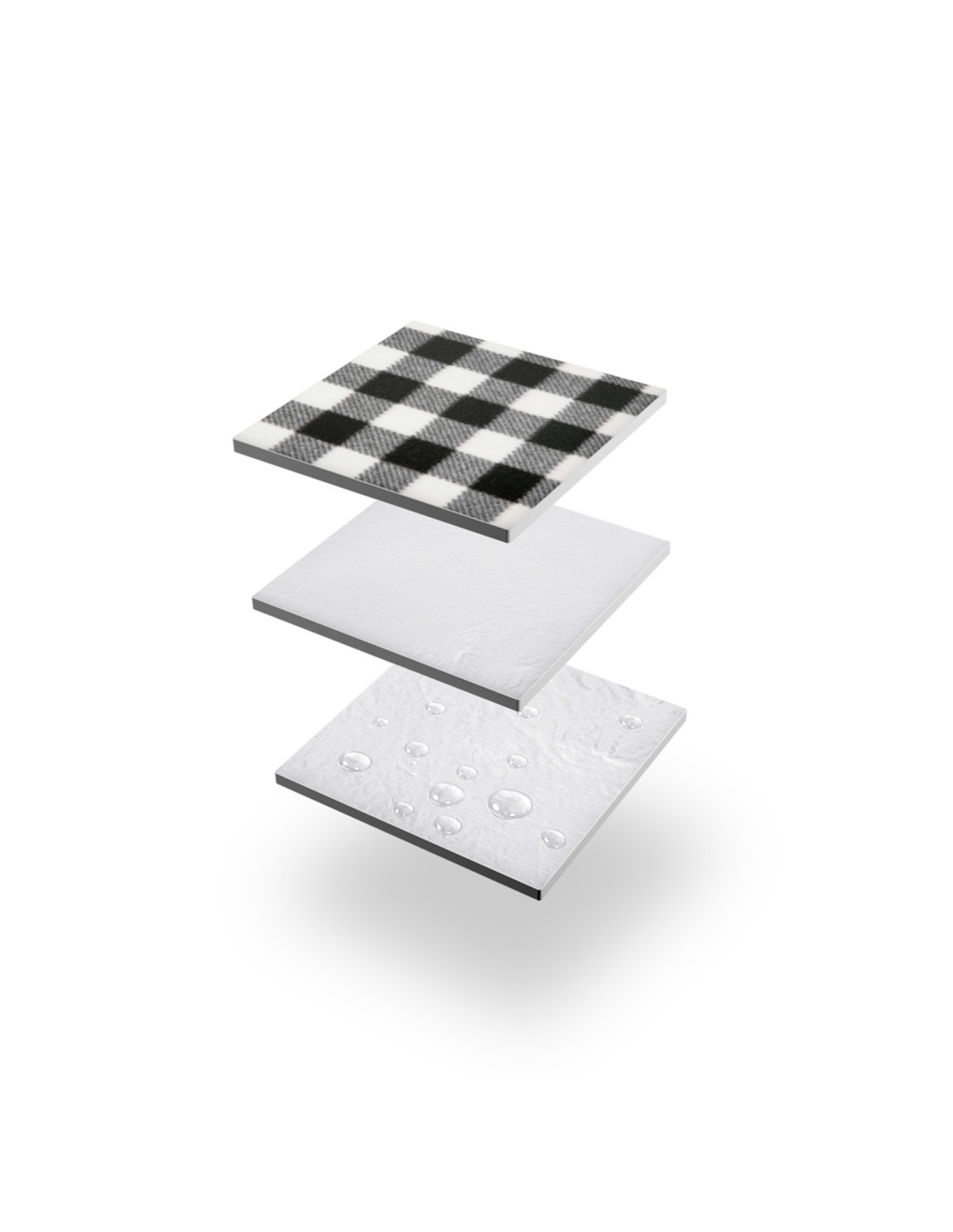 NC2311 besteht aus einem dreilagigen Material, das eine hohe Wärmeisolierung und Schutz vor Feuchtigkeit bietet. Die oberste Schicht besteht aus kuscheligem Fleece, die mittlere Schicht aus dünnem Schaumstoff und die unterste Schicht aus einer Aluminium-PE-Beschichtung, die wirksam vor Kälte und feuchtem Boden schützt. Dadurch eignet sich die Decke auch perfekt für kältere oder nasse Böden und sorgt den ganzen Tag über für Komfort.