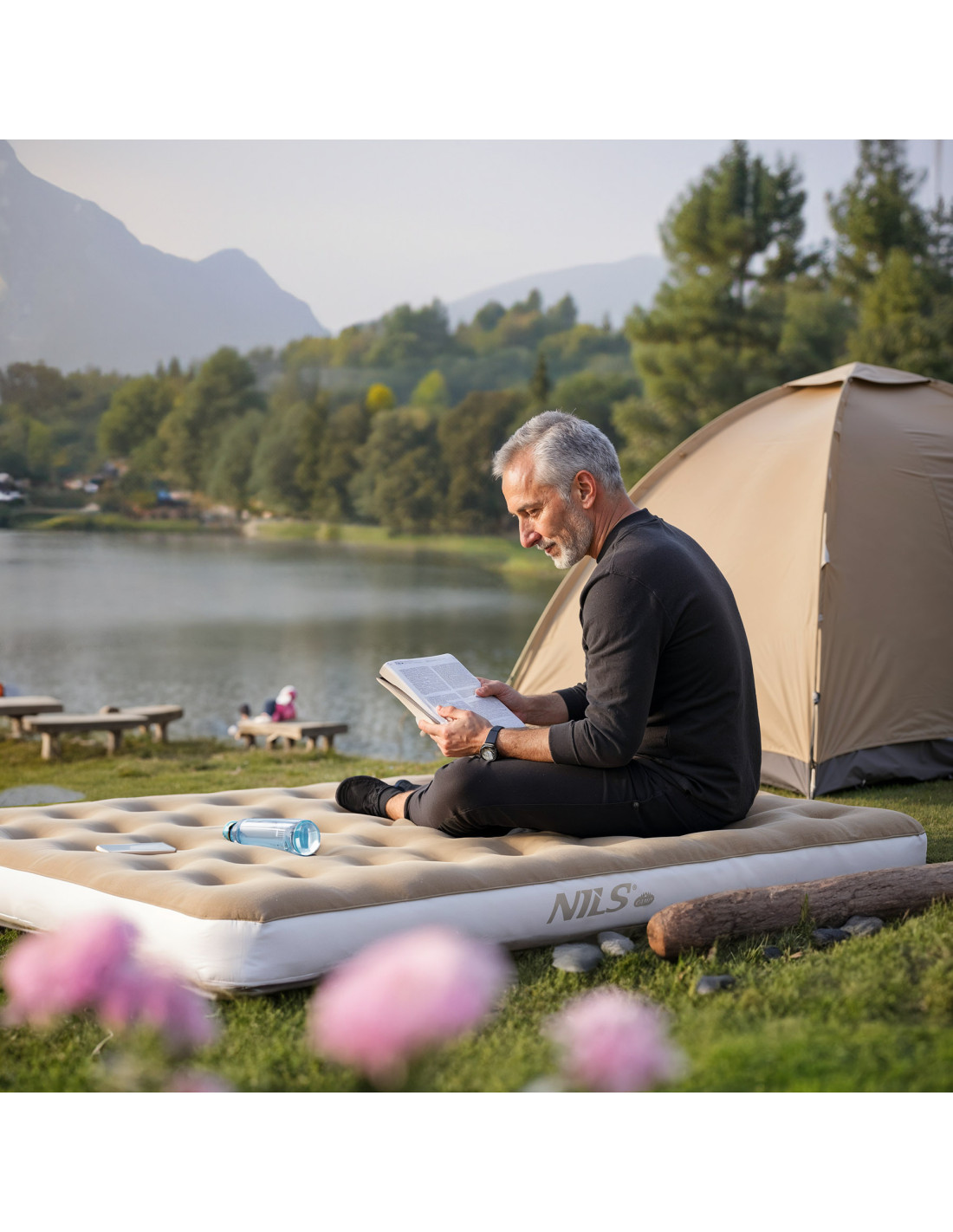 Die Matratze besteht aus strapazierfähigem PVC, das abriebfest, reißfest und leicht zu reinigen ist. Die innere Struktur unterstützt eine gleichmäßige Verteilung des Körpergewichts, was zu einem komfortablen Schlaf und Erholung führt. Das Material ist luftundurchlässig, sodass die Matratze lange Zeit den richtigen Druck hält, ohne dass sie häufig aufgepumpt werden muss. Die Unterseite der Matratze ist zusätzlich verstärkt, was ihre Stabilität auch auf unebenem Untergrund verbessert.