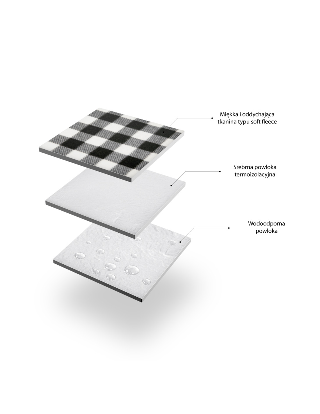 Die Decke besteht aus zwei Materialschichten. Die obere Schicht ist ein bequemer und weicher Schaumstoff, der sich durch die Weichheit und den Schutz vor dem kalten Boden auszeichnet. Dies verbessert selbstverständlich den Benutzungskomfort. Auf dem unteren Teil befindet sich eine Schicht aus Aluminium, die wasserdicht ist und es ermöglicht, die Decke z.B. auf feuchtem Sand oder auf dem mit Tau bedeckten Gras zu verwenden. Diese beiden Stoffe bilden eine ausgezeichnete Wärmedämmschicht.