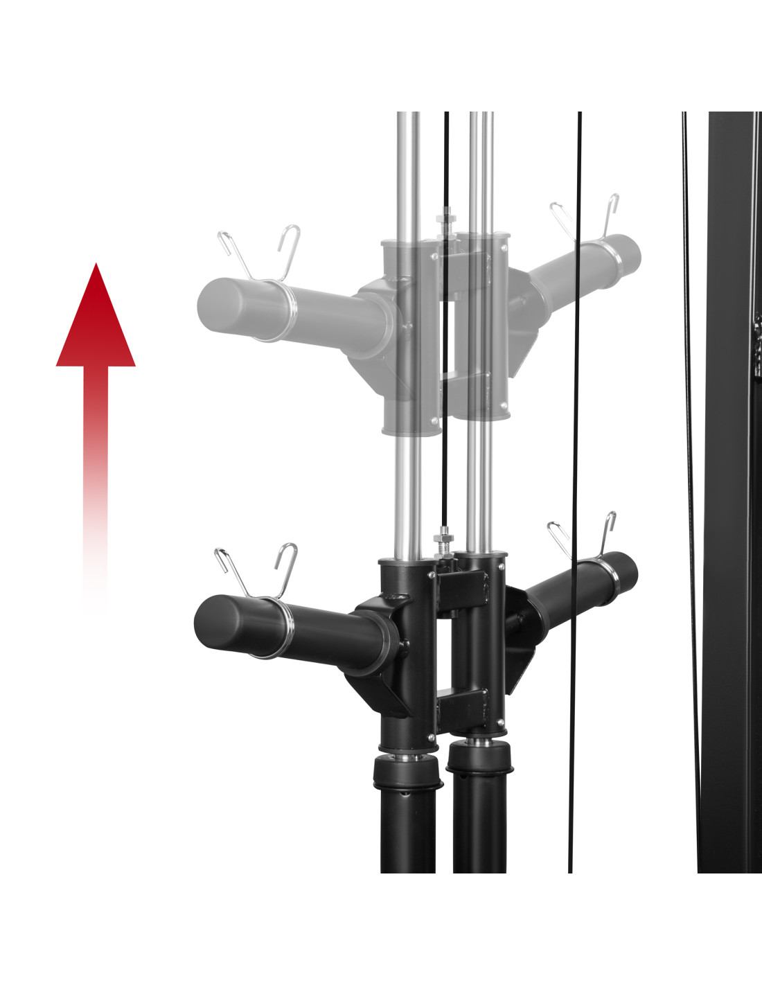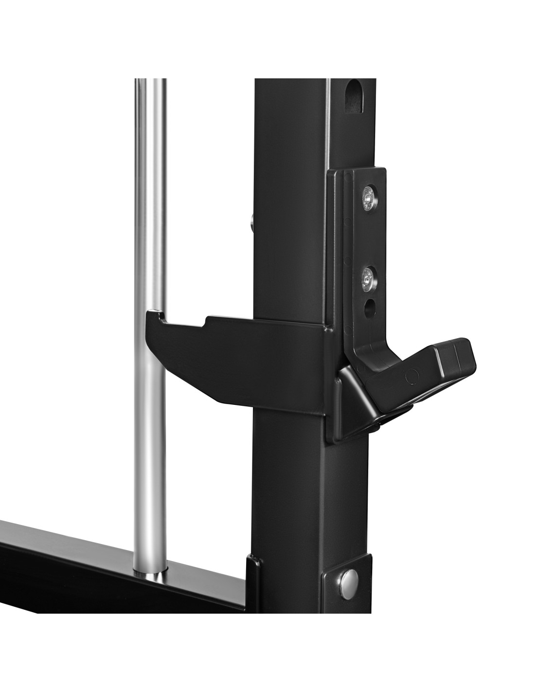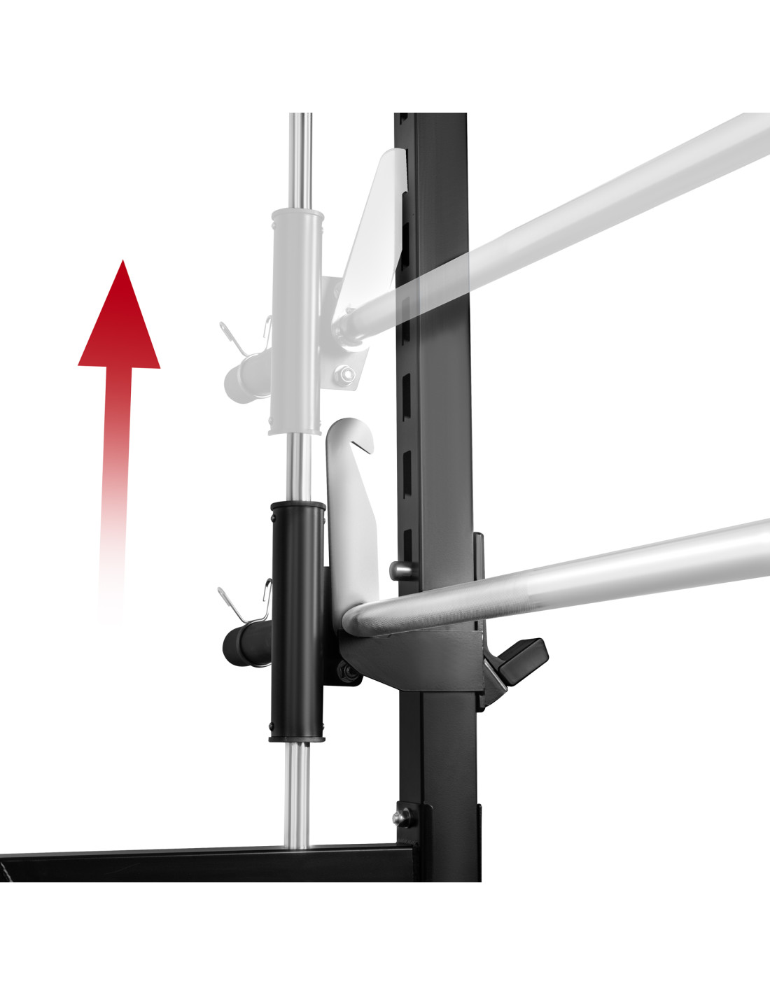 Die Edelstahl-Führungen gewährleisten hohe Steifigkeit und einen extrem flüssigen Lauf der Hantel. Das Verriegelungssystem mit Stahlhaken ermöglicht ein schnelles und sicheres Ablegen der Hantel in jeder Höhe.