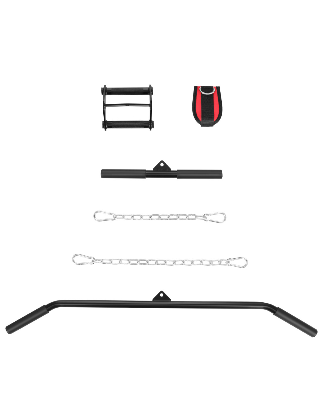 - Kabelzug-Zubehör (Dreiecksgriff, Knöchel-/Handgelenkband, kurzer gerader Griff, zwei Ketten, langer Curl-Stab),