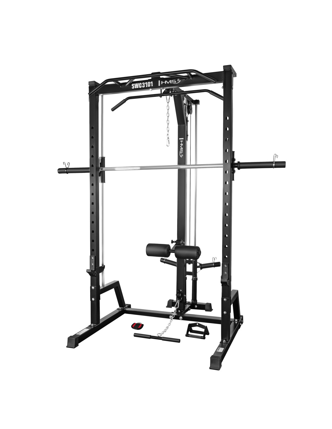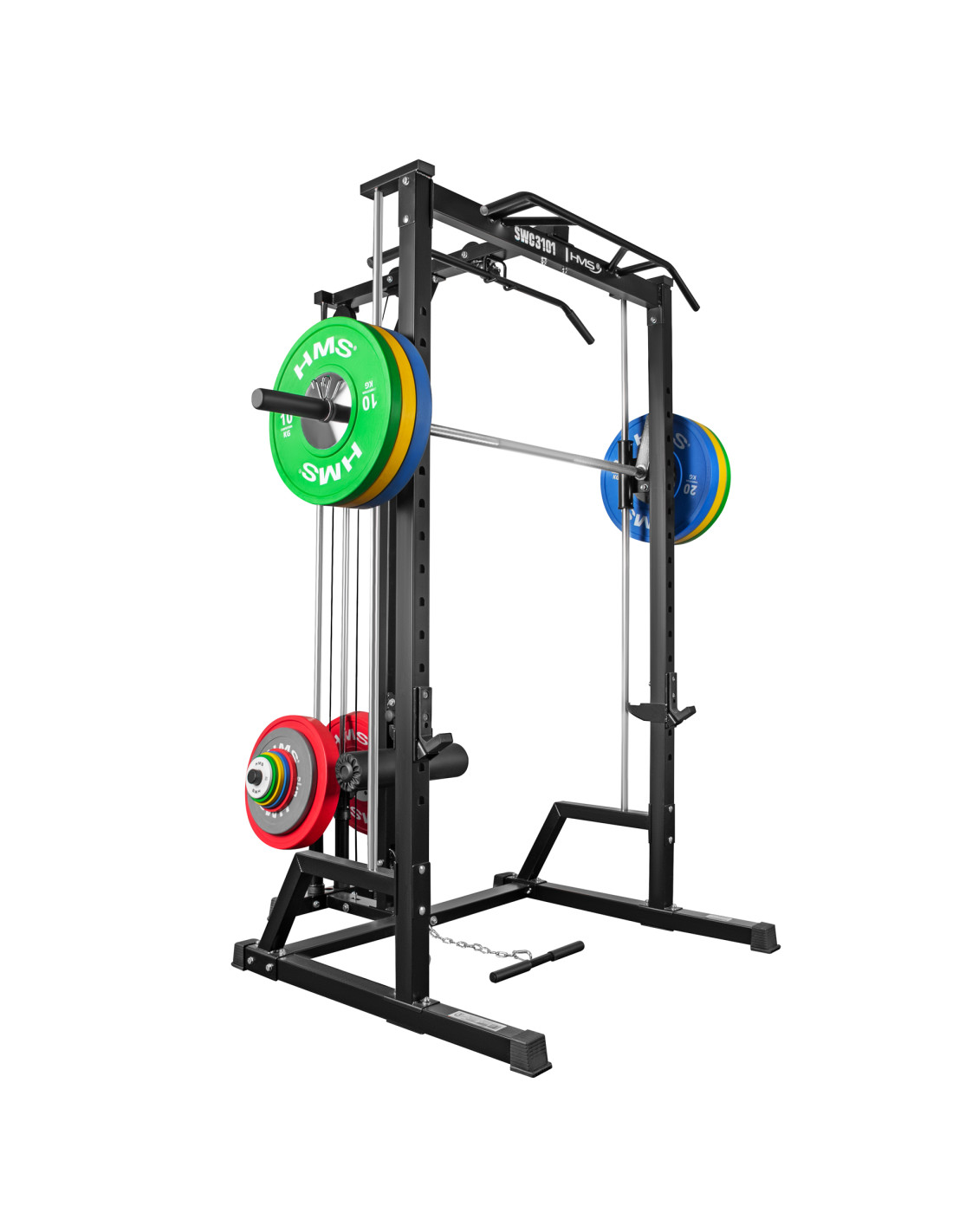 Die SWC3101 vereint drei Geräte in einem: eine Smith-Maschine, einen Hantel-Rack (Half-Rack) sowie einen oberen und unteren Kabelzug, der mit olympischen Scheiben beladen wird. So lassen sich nahezu alle Muskelgruppen trainieren – von Grundübungen bis hin zu Isolationsbewegungen. Das Gerät bietet: