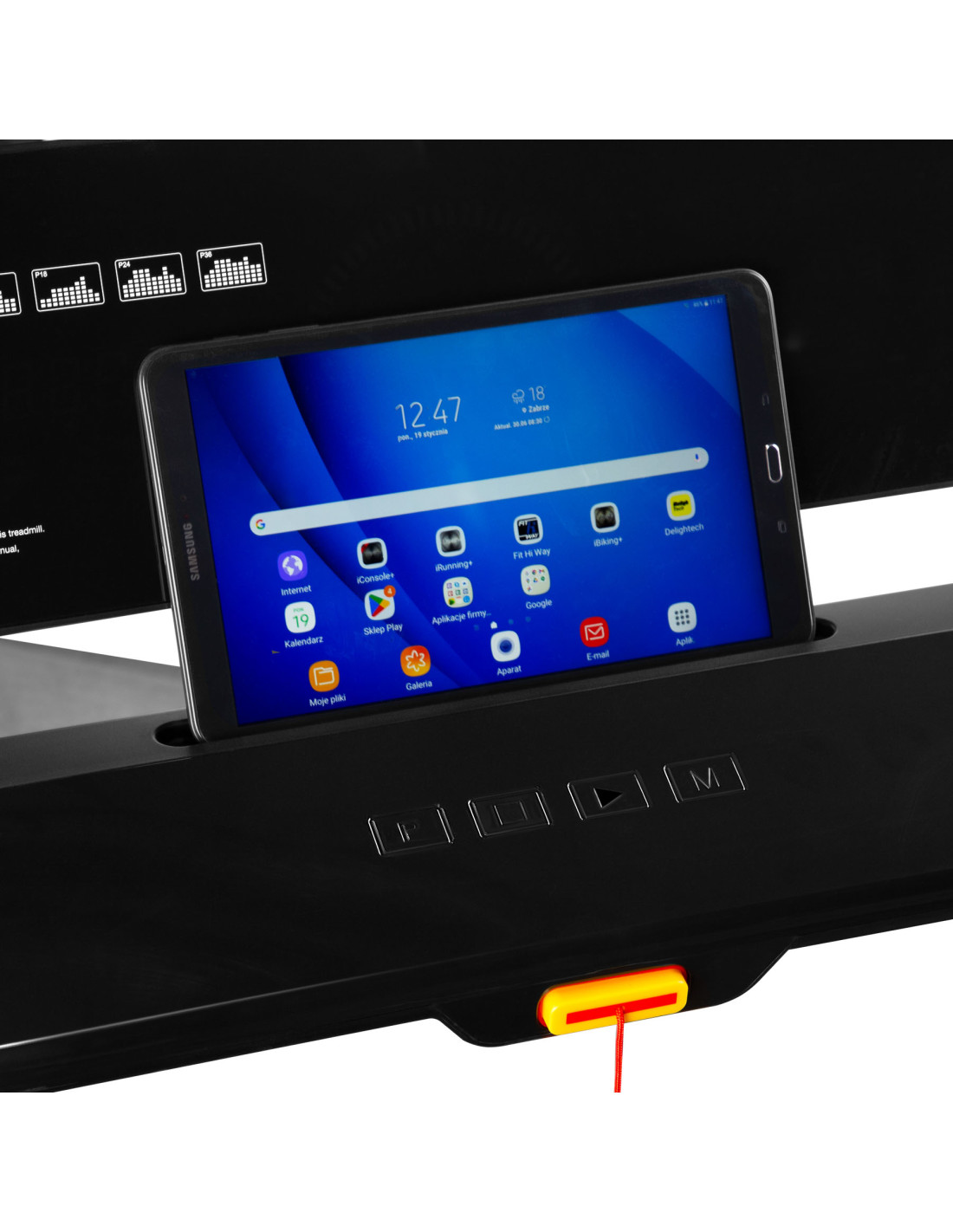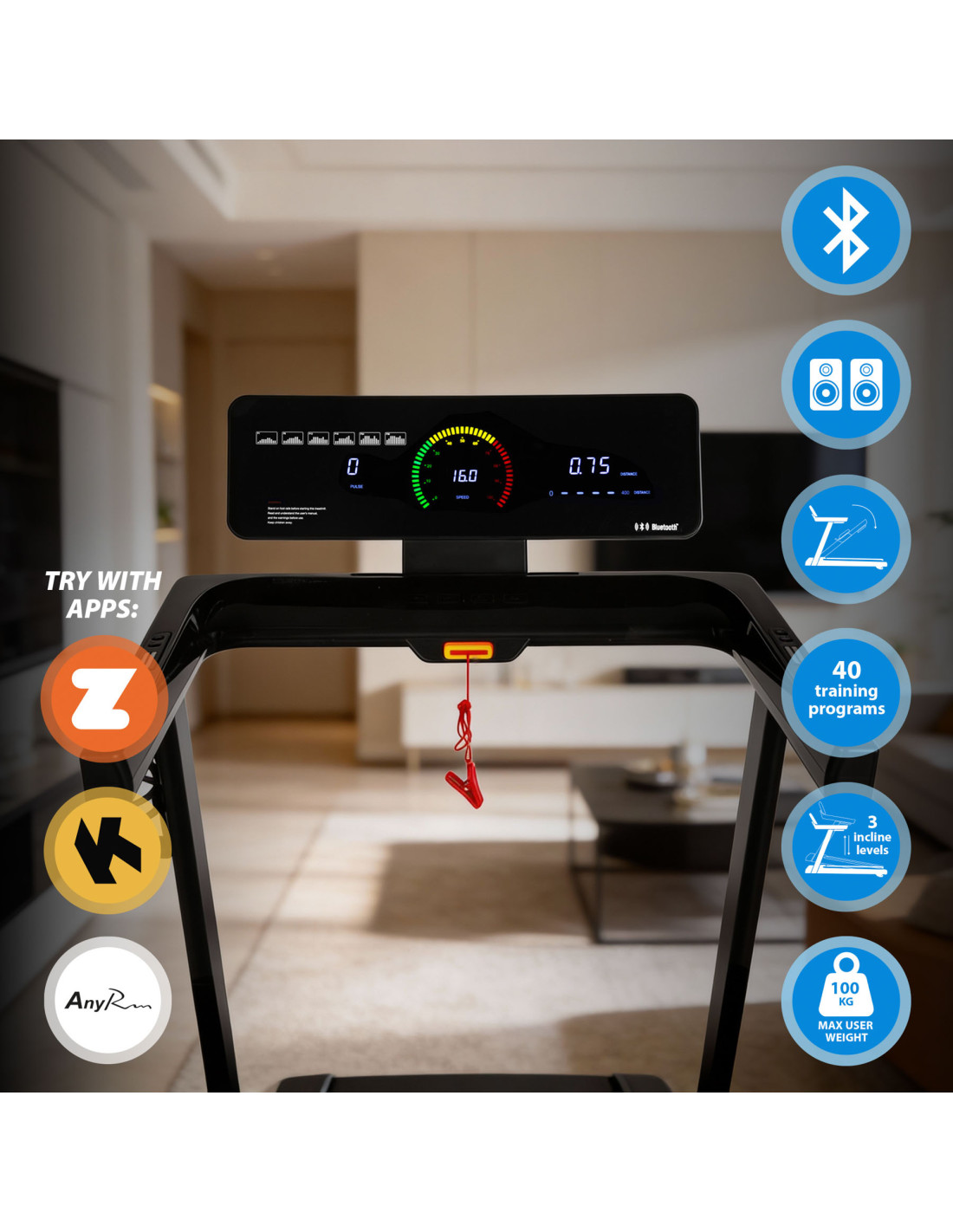 - Sicherheitsschlüssel – sofortiger Stopp des Laufbands im Notfall,