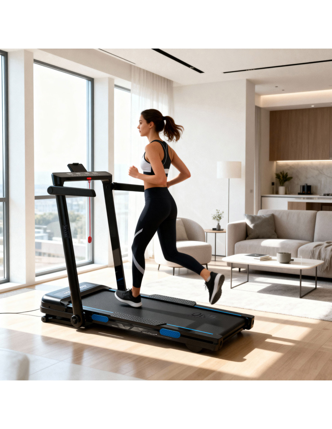 Die schlanke Form im zusammengeklappten Zustand ermöglicht eine einfache Aufbewahrung unter dem Bett oder an der Wand – ideal für Wohnungen und kleinere Räume. Der integrierte Tablet- oder Smartphone-Halter erlaubt die komfortable Nutzung von Apps, Videos oder Musik während des Trainings.
