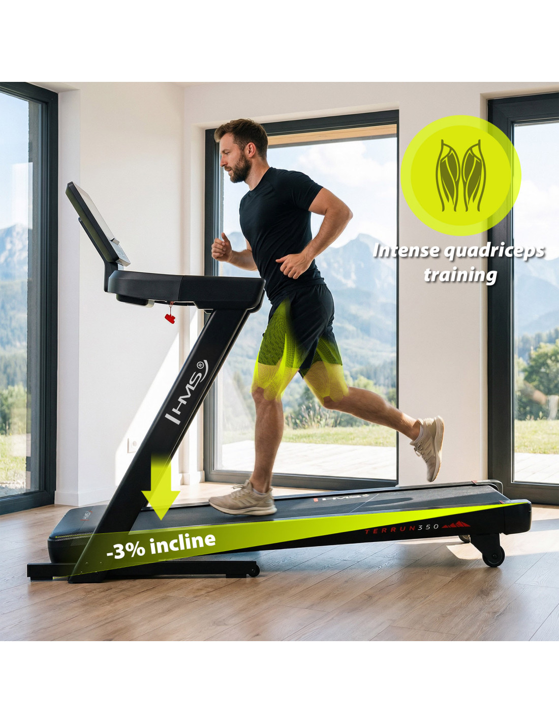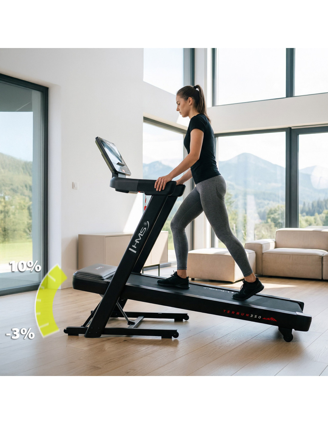 Das Laufband TERRUN350 bietet eine Neigungsverstellung von -3 % bis 10 %, mit der sowohl Bergab- als auch Bergaufläufe simuliert werden können. Diese Lösung sorgt für abwechslungsreiche Trainingseinheiten, erhöht die Muskelaktivierung und verbessert Kondition sowie Ausdauer.