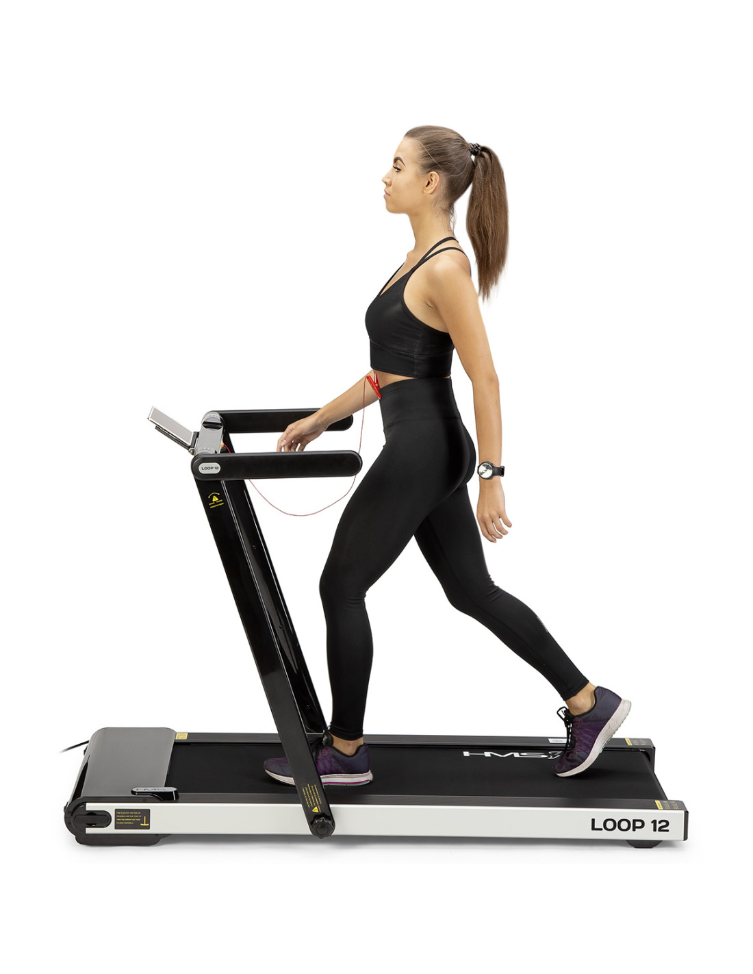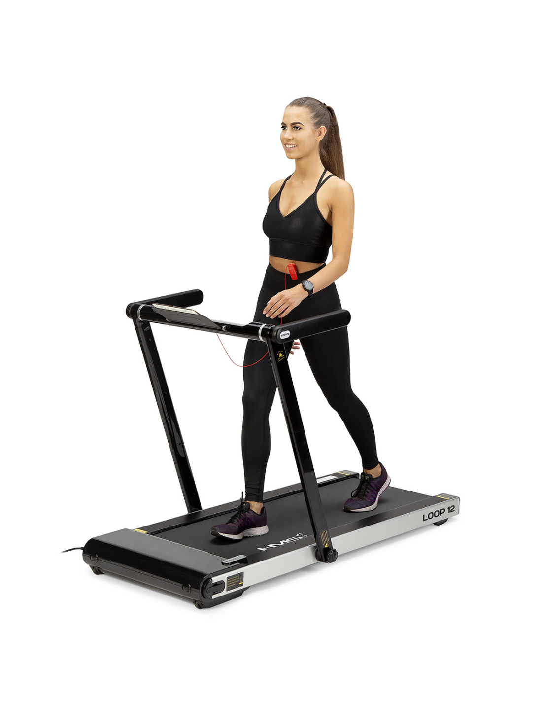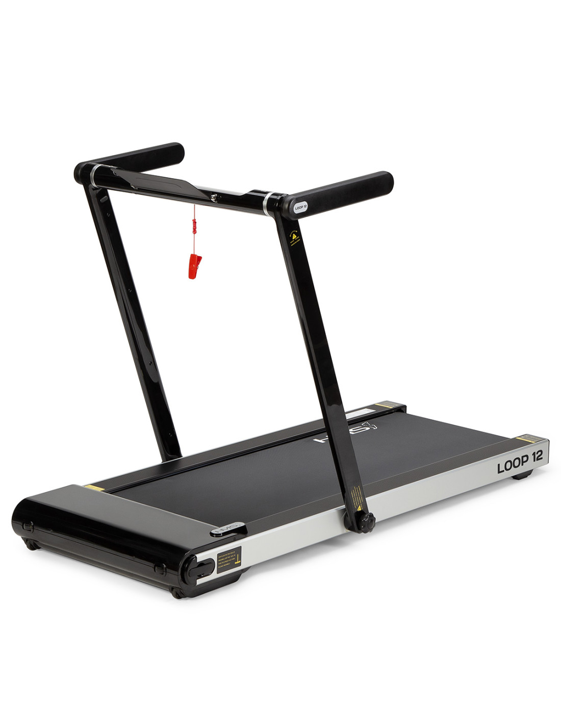 Ein weiterer Vorteil ist die Größe dieses Laufbands. Mit dem klappbaren Handlauf ist es platzsparend. Die Position des Laufbands LOOP12 lässt sich sowohl vertikal als horizontal ändern. Dies wird Ihnen keine Schwierigkeiten bereiten, weil unser Produkt mit den Transporträdern ausgestattet ist.