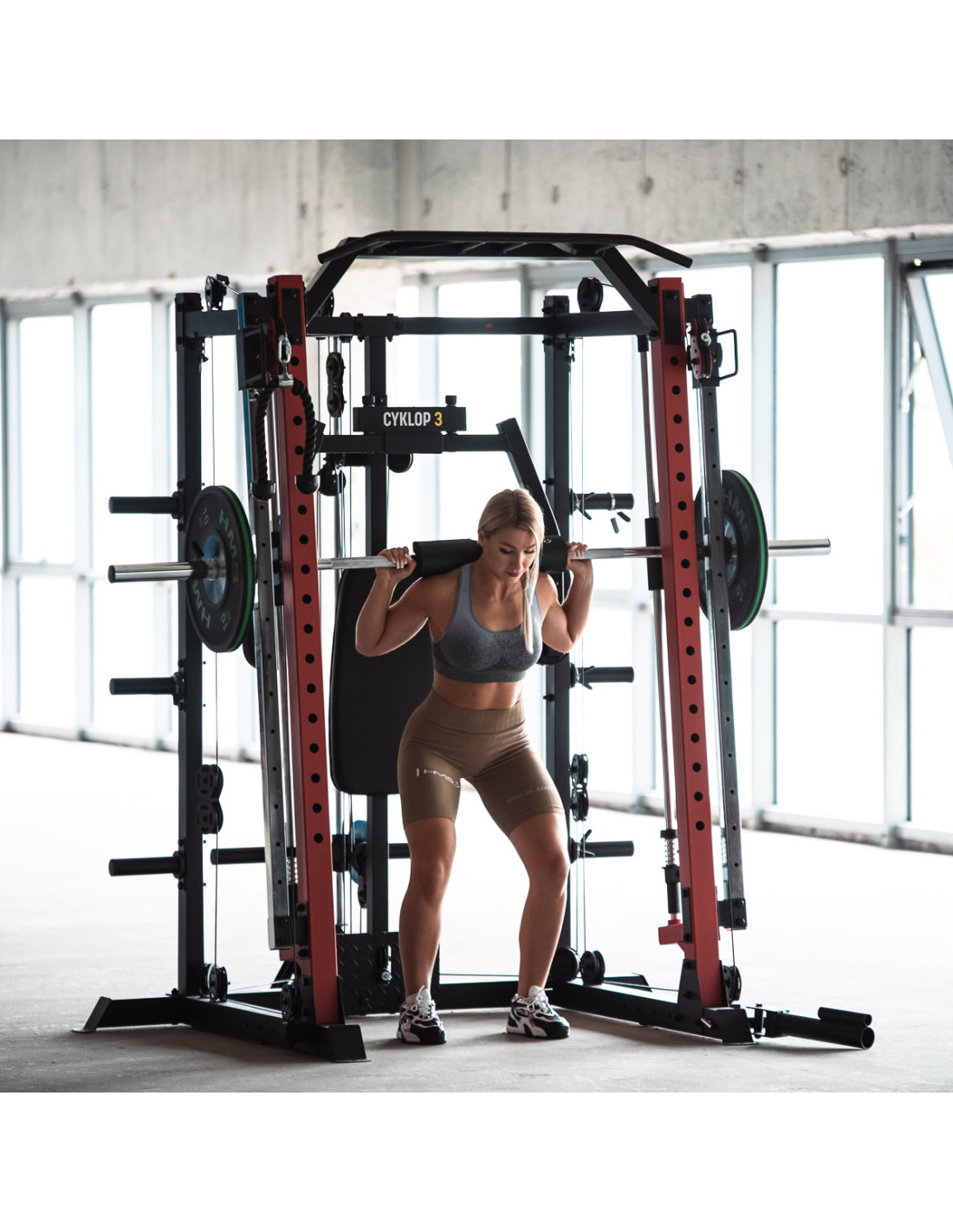 CYKLOP 3 bietet viele Annehmlichkeiten den Trainierenden an, u. a.: Trainingsbank, schnelle Höhenverstellung der Latzug-Station. Eine spezielle Rolle aus Schaumstoff schützt hingegen den Trainierenden bei Kniebeugen. Die Handgriffe der Klimmzugstange sind gerändelt, um die Griffigkeit zu erhöhen. Die weiche Rückenlehne der Trainingsbank und Butterfly-Station werden ein langes und bequemes Training gewährleisten. Um Hantelscheiben richtig aufzubewahren, hat der Benutzer einen funktionell vormontierten Ständer mit einer Federverschluss zur Verfügung.