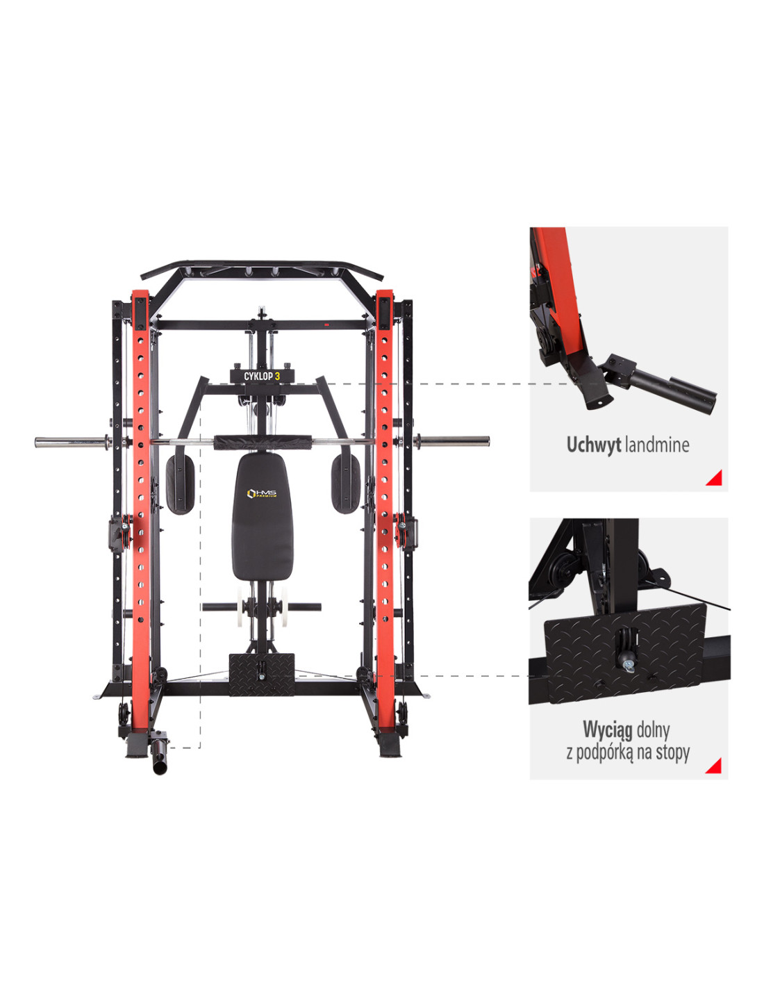 CYKLOP 3 steht für eine Kombination aus der Kraftstation, Klimmzugstange, Butterfly-Station, dem Ständer für Langhantel und zwei Latzug-Stationen mit der Höhenverstellung. Im Set mit CYKLOP 3 finden Sie auch eine Trainingsbank, die mit der Funktion der Verstellung vom Neigungswinkel ausgestattet ist. Diese Funktion betrifft Rückenlehne, Sitz und Curlpult mit dem Griff für Langhantel. Wenn wir das alles zusammenfassen, bekommen wir ein vielseitiges Sportgerät. Daher ermöglicht das Produkt die Durchführung von Trainings für alle Muskelgruppen. Die Effizienz der Übungen und die Trainingsmöglichkeiten werden dank dem im Lieferumfang enthaltenen Sportzubehör erweitert, d. h. Griffe für Kabelzüge, Dip-Station zur Montage und Landmine-Halterung für Langhantelstange.