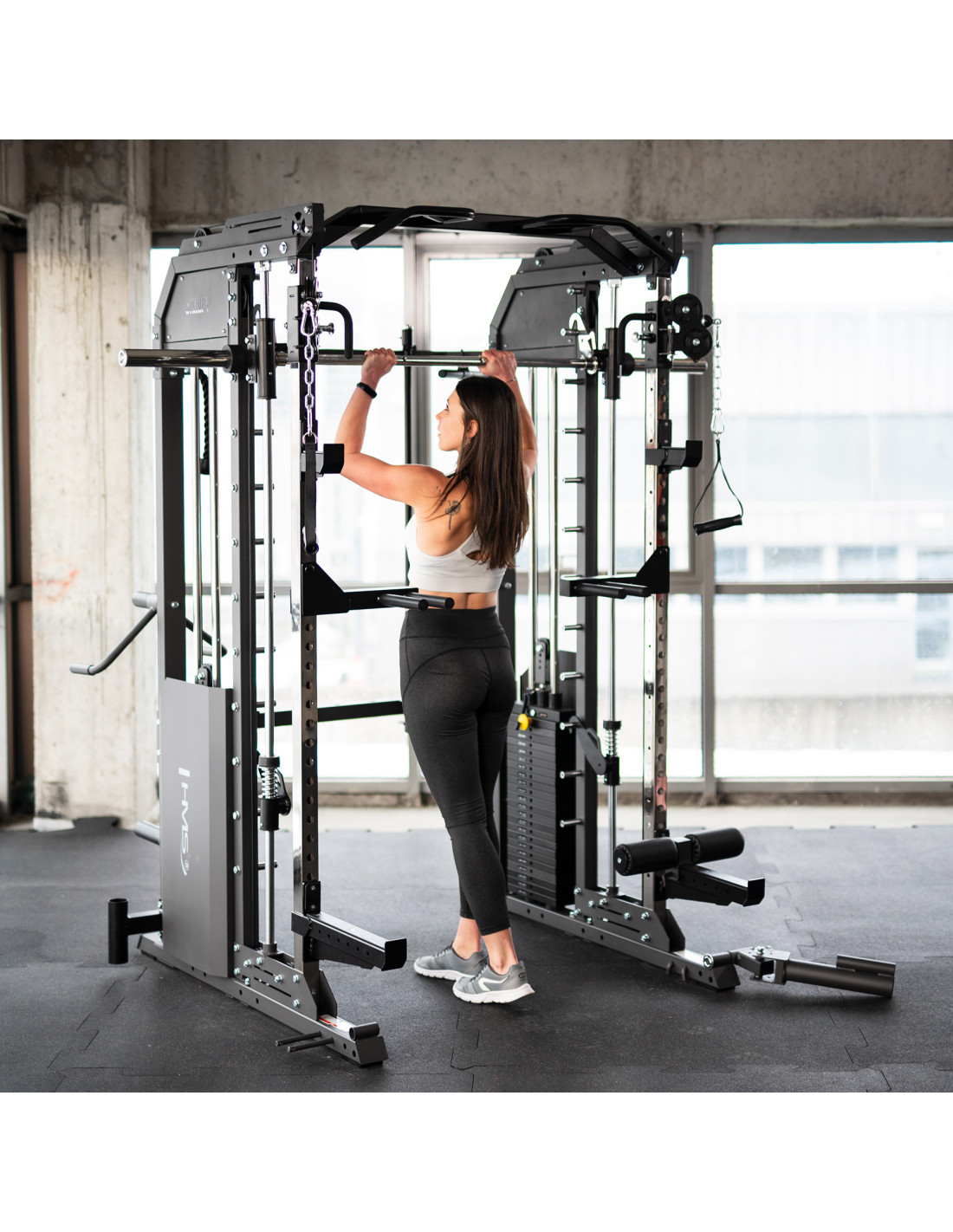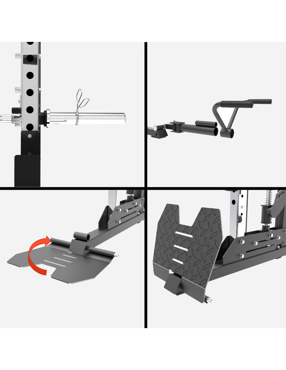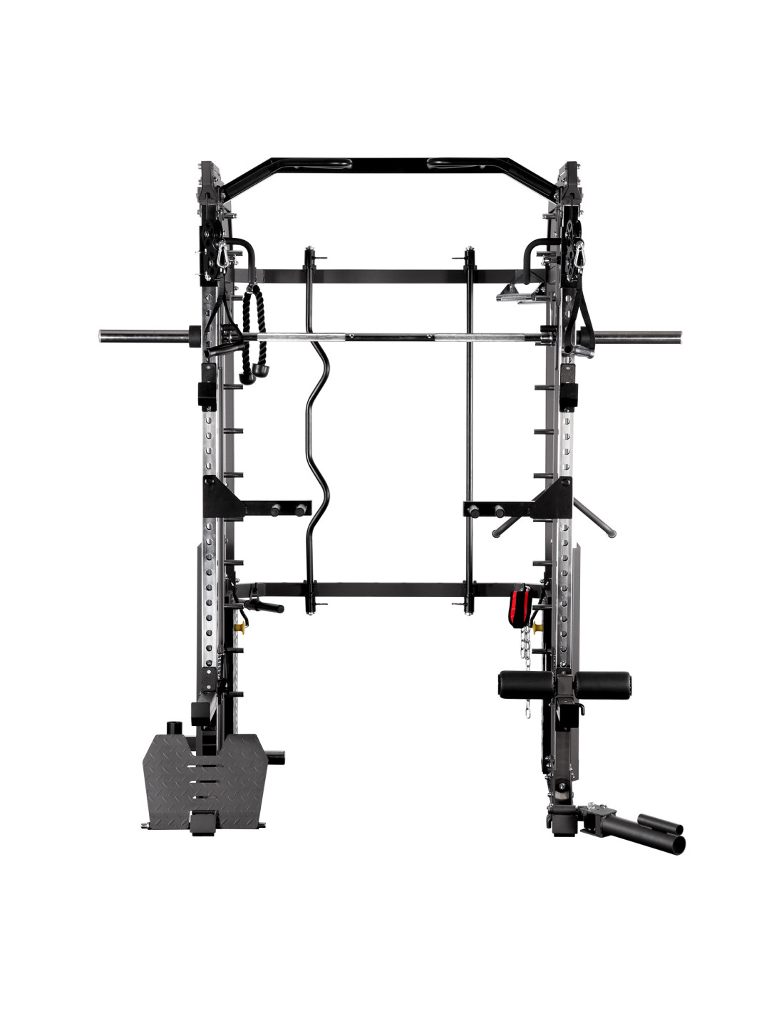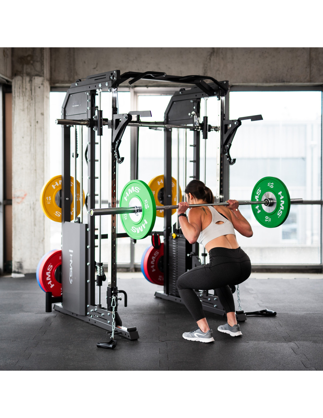 Smith Machine – ermöglicht ein komplexes Training und hat eine verstellbare Höhe sowie garantiert Sicherheit vor dem Herunterfallen der Belastung.