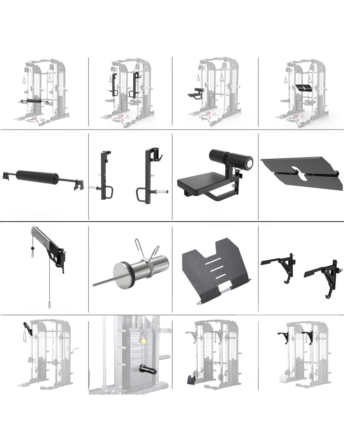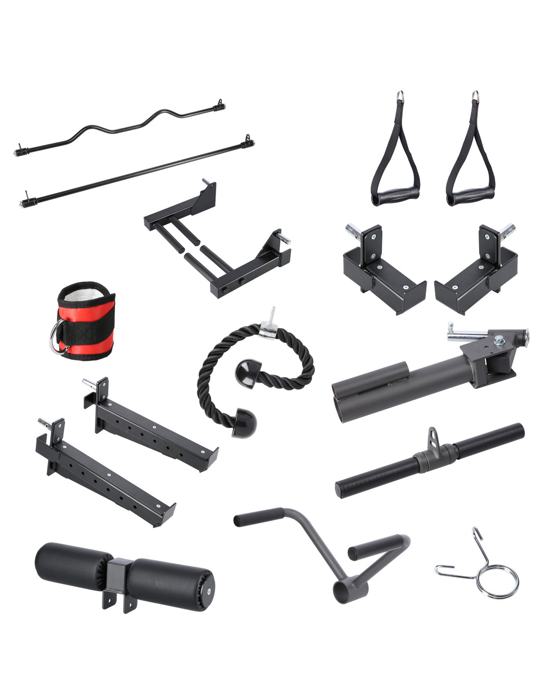 Griffe - Im Set gibt es verschiedene Griffe, dh: klassische Griffe, Griffe für Hantelstange, einen geraden Griff, Curl-Griff, Fußschlaufen, Trizepsseil, Parallelgriff, kurze Stange, Landmine-Halterung, Halterung für Aufbewahrung einer Hantelstange, Haken für Widerstandsbänder, drei Ketten.