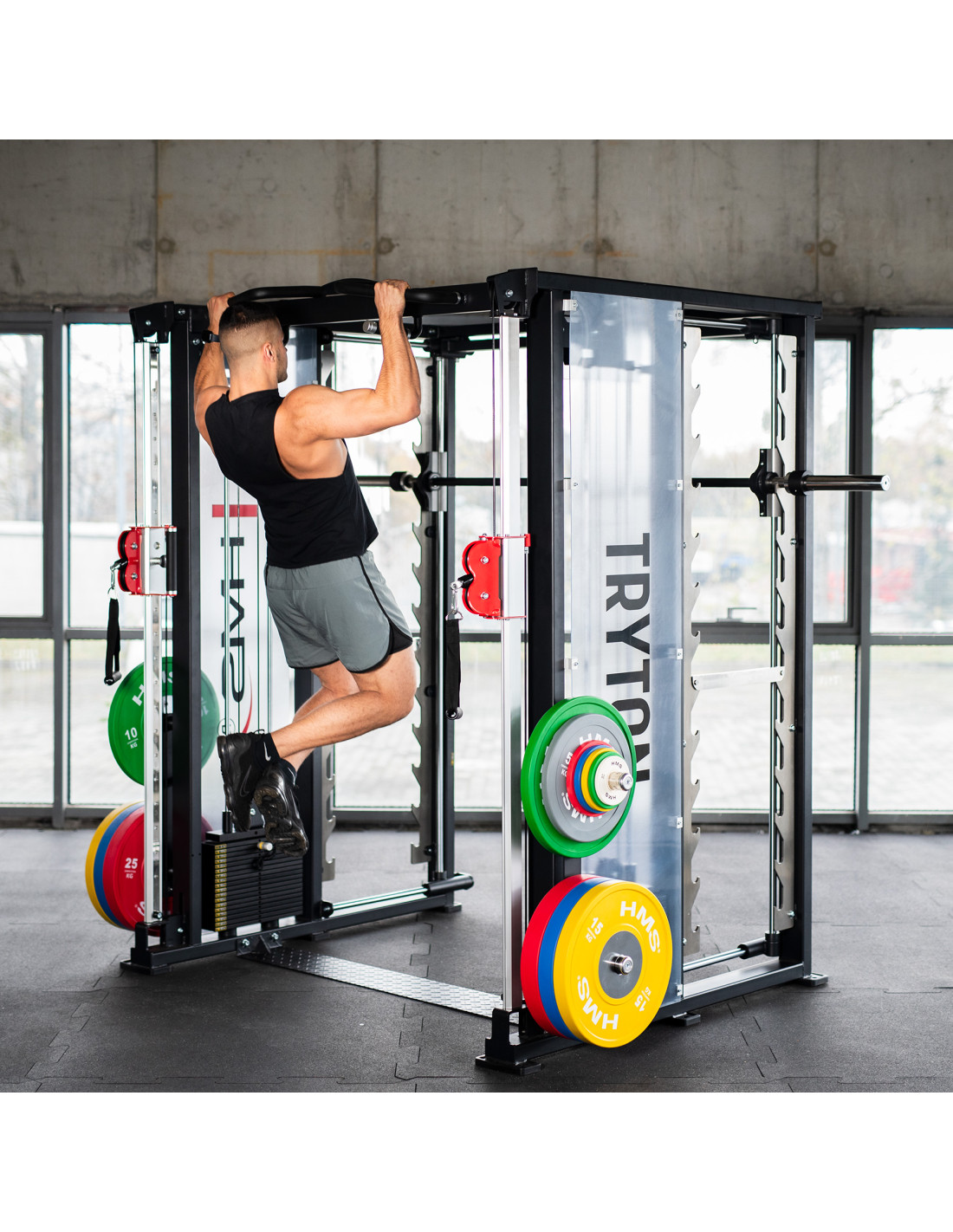 Dank seiner robusten Konstruktion und innovativen Lösungen garantiert der Tryton auch bei intensiven Trainingseinheiten absolute Sicherheit. Die Sicherheitsstützen am 3D-Smith-Kran erhöhen die Sicherheit, und das präzise Aufhängesystem der Langhantel an 12 Haken gewährleistet einen hohen Nutzungskomfort. Die Stabilität der Geräte und die Liebe zum Detail machen Tryton zur idealen Wahl für Fitnessclubs, die auf Qualität und Modernität setzen.