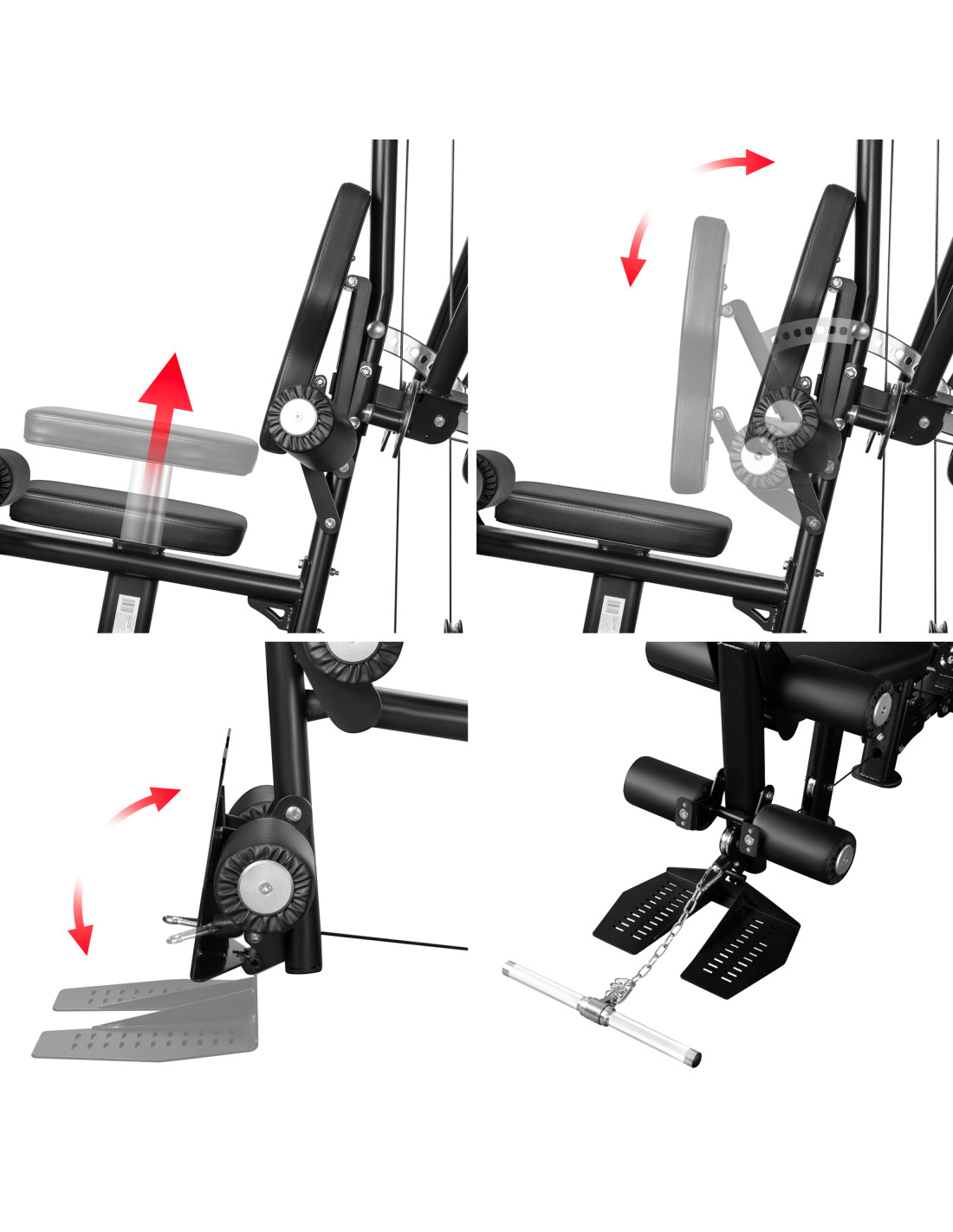 - Vielseitigkeit – oberer und unterer Seilzug, integrierte Beinpresse, Butterfly-/Drückarme, Beinstrecker-Station.