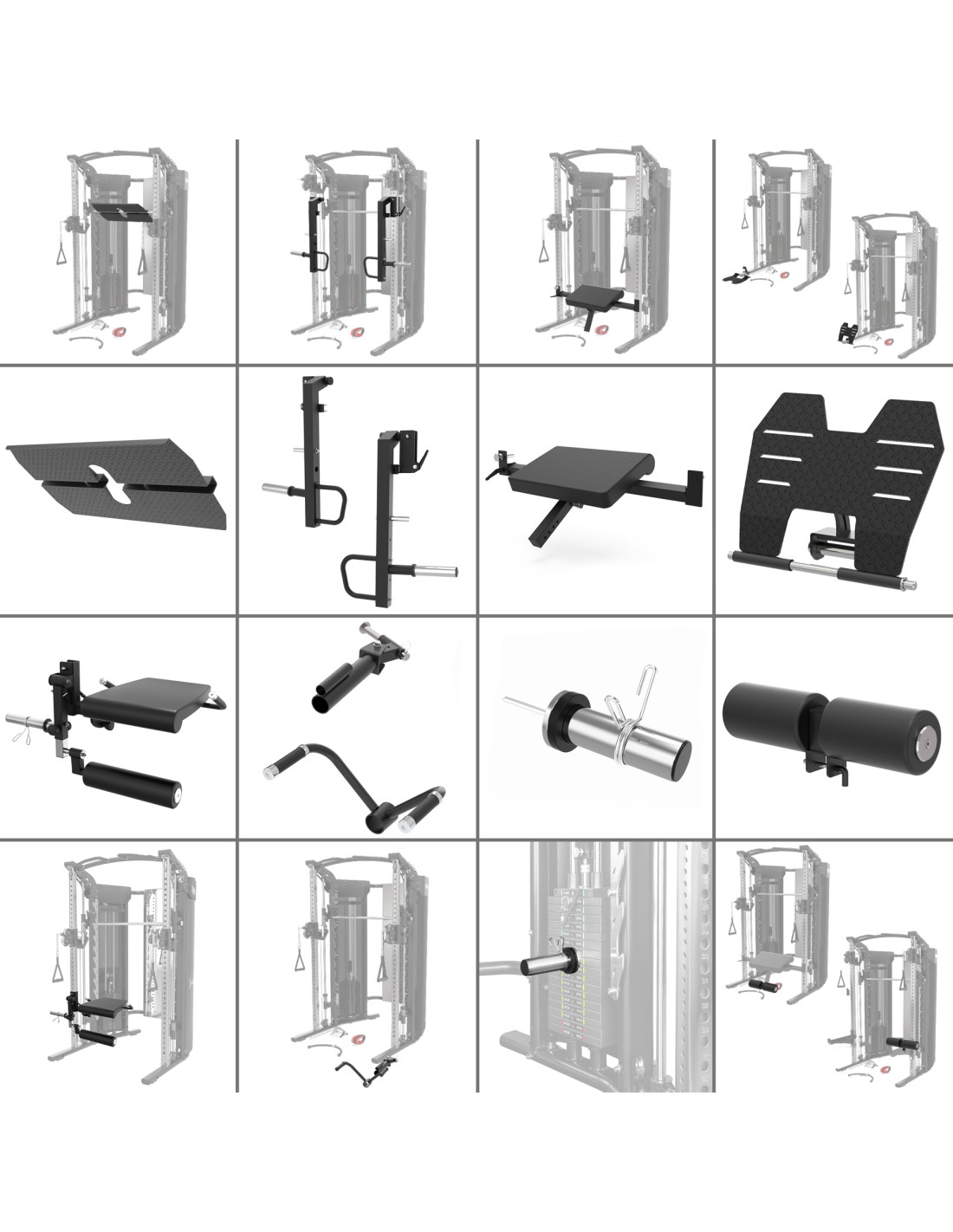Im Set CYKLOP 10 enthalten: Erweiterung für den oberen Zug, Sitz mit Fixierung, Oberschenkel-Polster, sechs Aufnahmedorne für Scheiben, Hantel-/Stangenhalter, Sicherheitsablagen (Spotter), Monolift, Smith-Adapterhülsen für olympische Scheiben, Dip-Griffe, Beinpresse-Platte, Jammer Arms, Rückenpolster für Hip Thrusts, Fußplatte für Crunches, Sitz für Beinstrecken (Leg Extension), Landmine-Aufnahme mit Griff, magnetischer Zusatz-Gewichtsbolzen, Feder-Schellen.