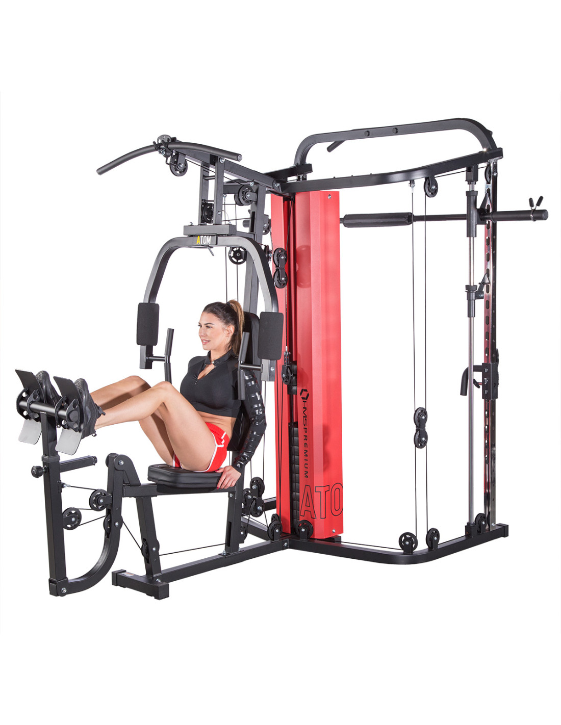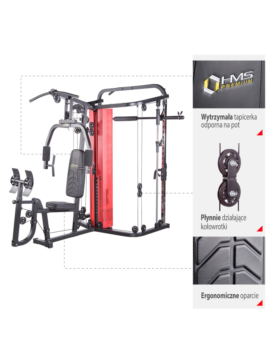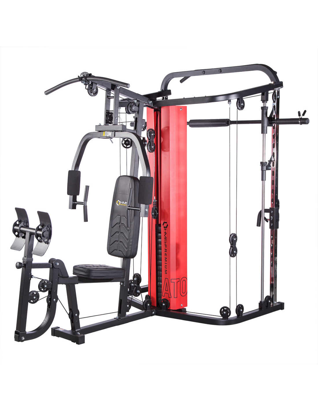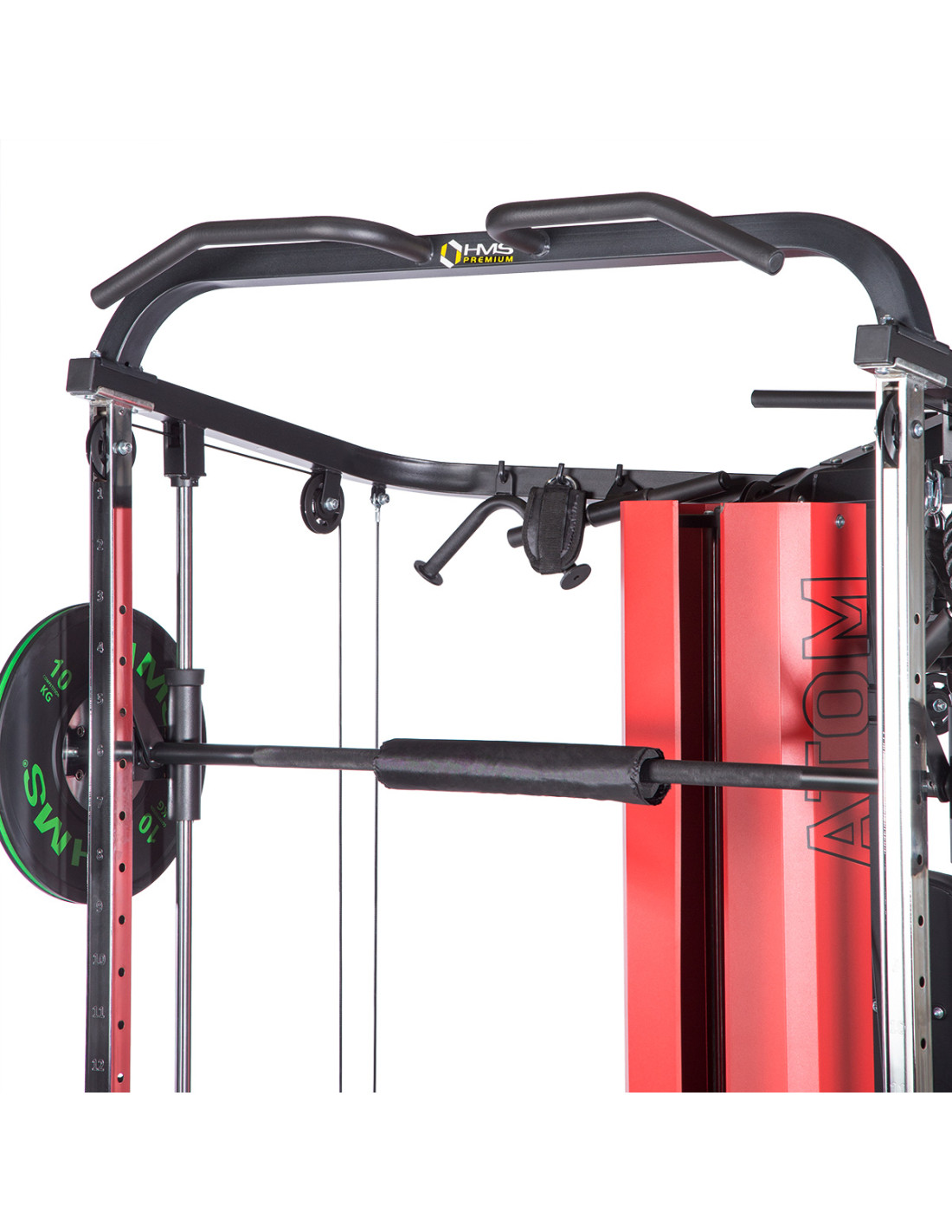 Das Sportgerät ATOM der Marke HMS ist eine Kombination aus einer Kraftstation und einer Multipresse (Smith machine). Dies gibt den Trainierenden viele Übungsmöglichkeiten und ermöglicht es, ein komplexes Training für den ganzen Körper durchzuführen.