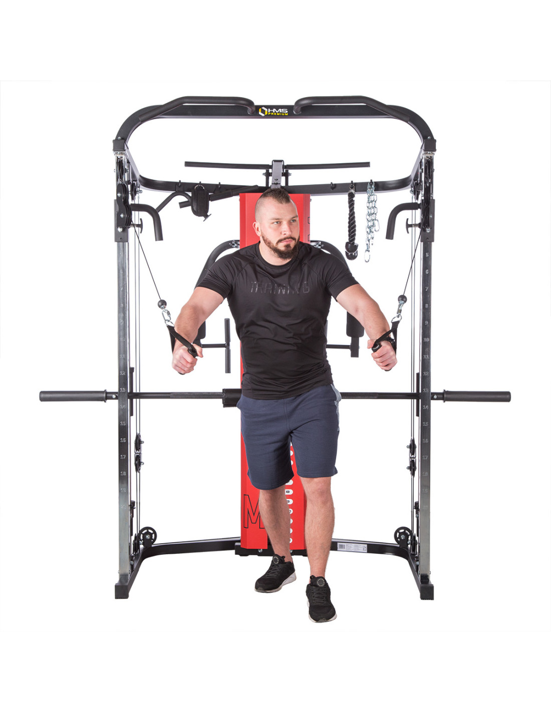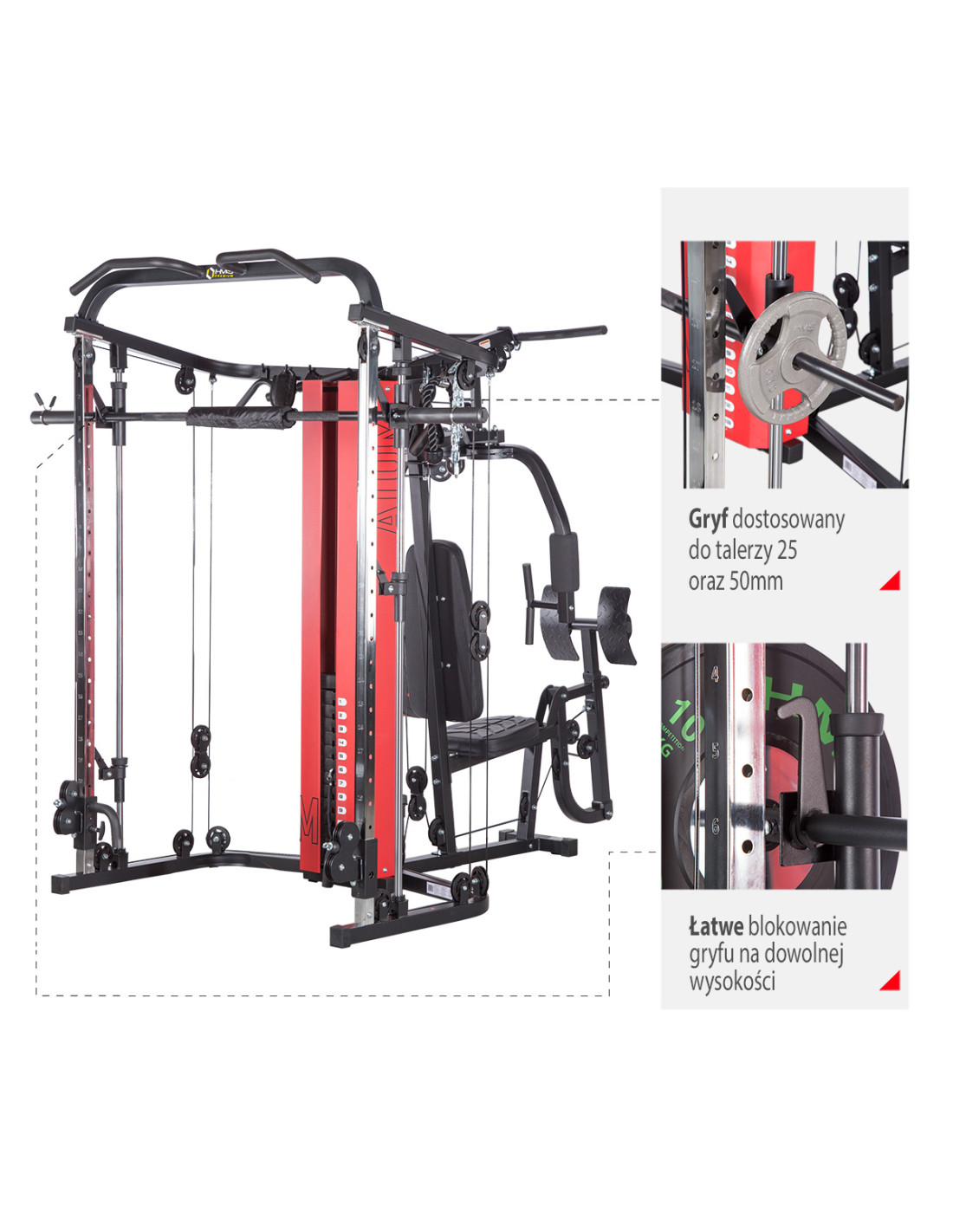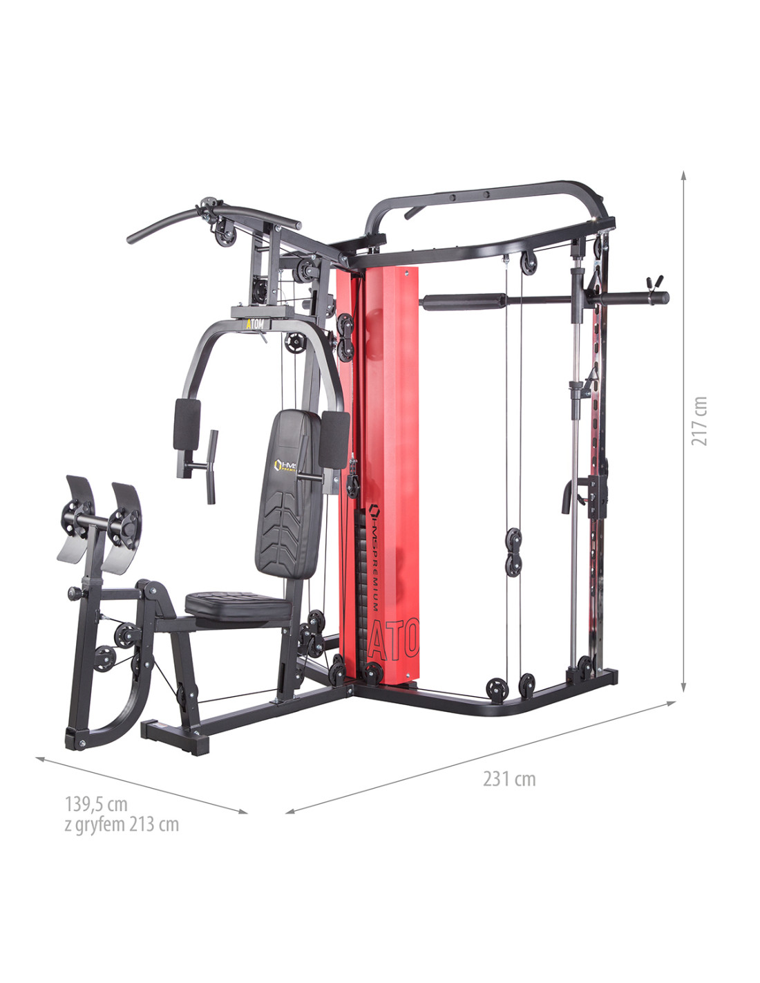 Das Sportgerät ATOM der Marke HMS ist eine Kombination aus einer Kraftstation und einer Multipresse (Smith machine). Dies gibt den Trainierenden viele Übungsmöglichkeiten und ermöglicht es, ein komplexes Training für den ganzen Körper durchzuführen.