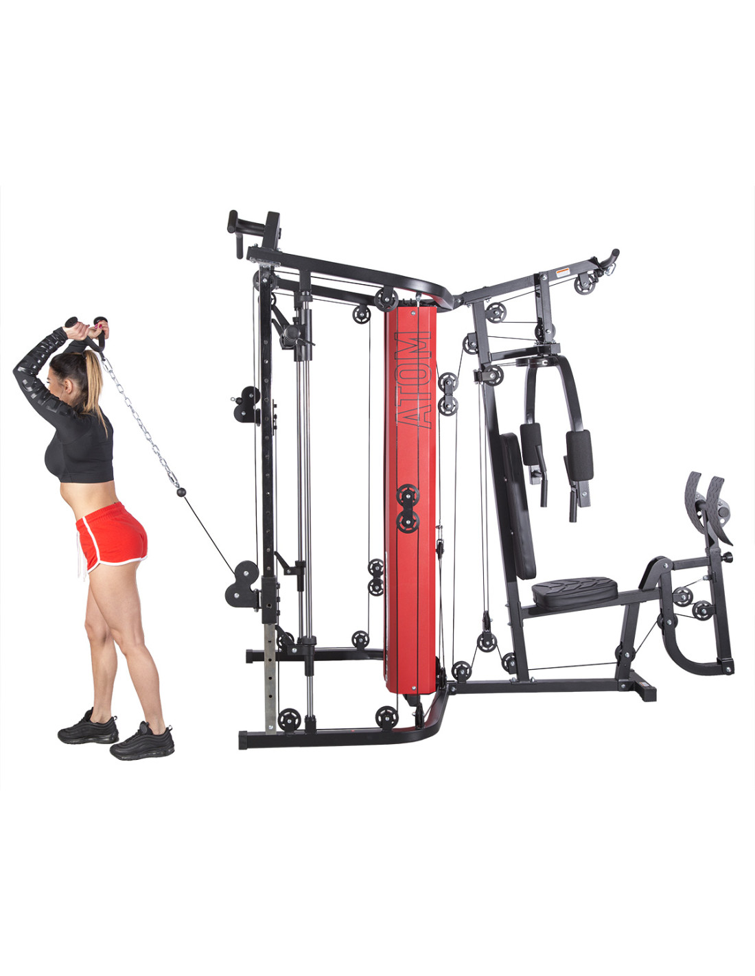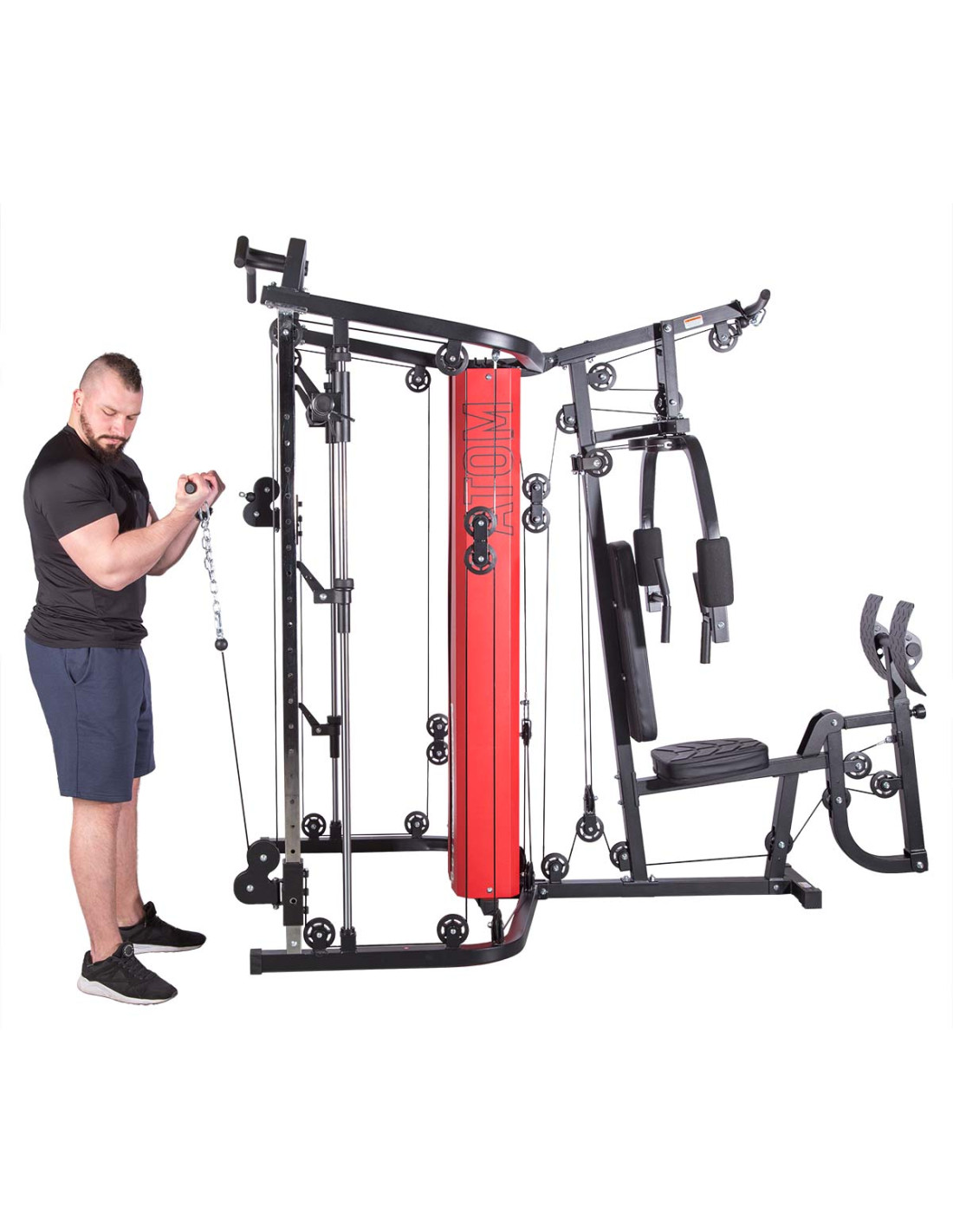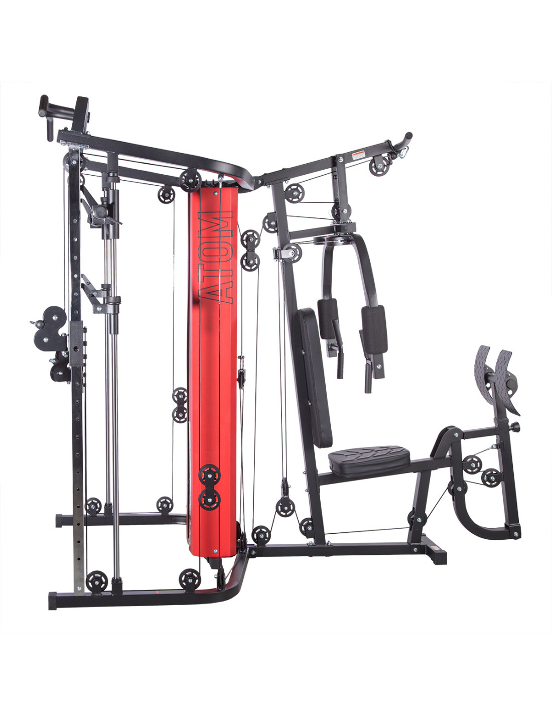 ATOM stellt dem Nutzer die Multipresse (sog. Smith machine), zwei Latzug-Stationen mit der Höhenverstellung, Butterfly-Arm, Beinpresse und Klimmzugstange zur Verfügung. Dank allen Bestandteilen dieser Konstruktion kann man Übungen für jede Muskelpartie machen. ATOM ist daher ein wirklich umfassendes Produkt. Im Lieferumfang finden Sie auch eine Sportausrüstung inkl. Griffe für Latzug-Station. Ihr Training wird also mehr effektiv.
