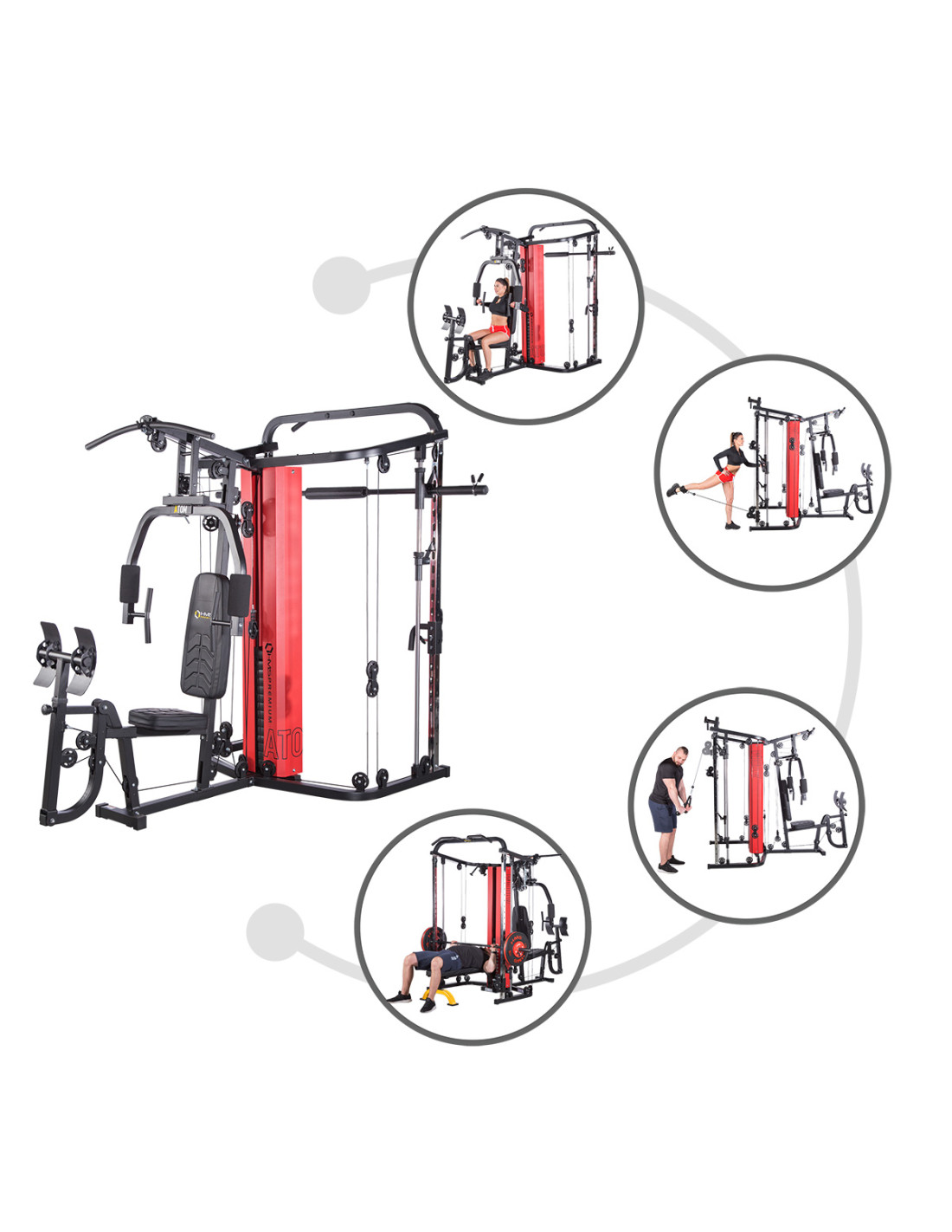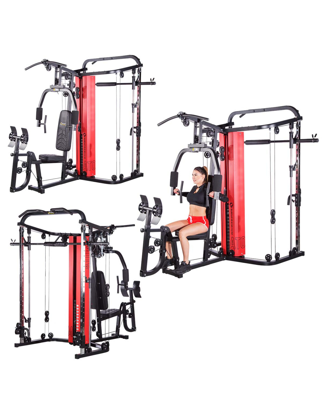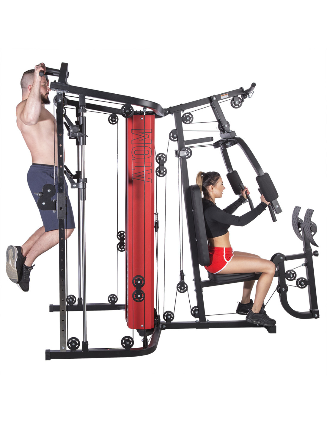 ATOM stellt dem Nutzer die Multipresse (sog. Smith machine), zwei Latzug-Stationen mit der Höhenverstellung, Butterfly-Arm, Beinpresse und Klimmzugstange zur Verfügung. Dank allen Bestandteilen dieser Konstruktion kann man Übungen für jede Muskelpartie machen. ATOM ist daher ein wirklich umfassendes Produkt. Im Lieferumfang finden Sie auch eine Sportausrüstung inkl. Griffe für Latzug-Station. Ihr Training wird also mehr effektiv.