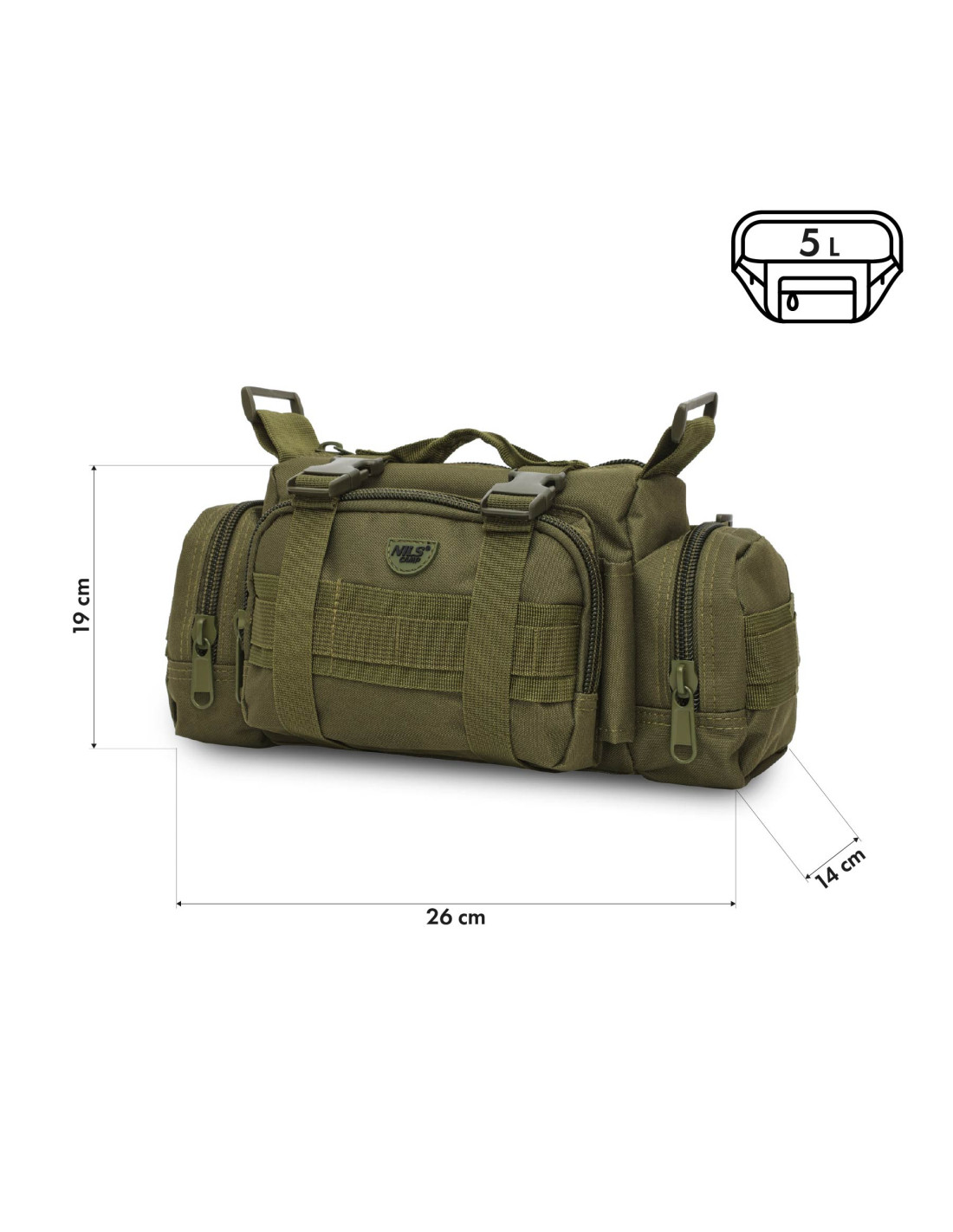 Die Tasche ist 26 cm breit, 19 cm hoch und 14 cm tief, was eine bequeme Nutzung ohne Einschränkung der Bewegungsfreiheit gewährleistet. Sie können sie klassisch an der Hüfte oder über der Schulter tragen – je nachdem, was für Sie am bequemsten ist. Es handelt sich um eine vielseitige Lösung, die sich Ihrem Lebensstil anpasst.
