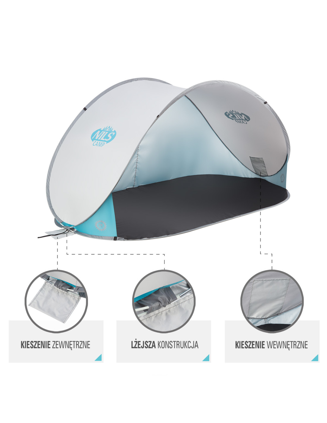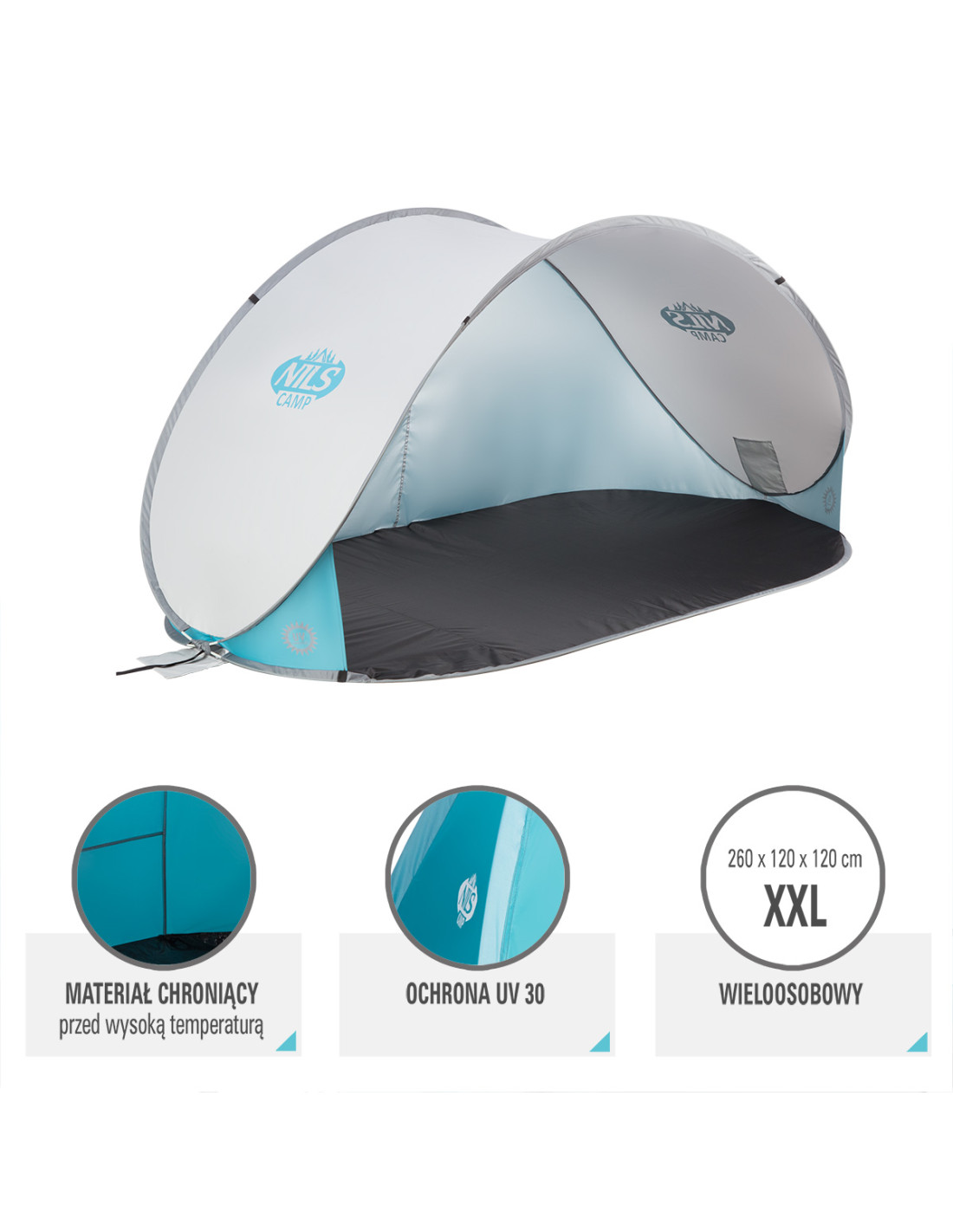 Das Zelt NC3174 wurde aus den hochwertigsten Stoffen hergestellt. Der Stoff auf dem Boden des Zeltes ist wasserdicht, so dass feuchter Sand kein Problem wird. Sie müssen auch keine Angst vor Regen haben. Im Zelt wurde die Technologie angewendet, die das Zelt vor Aufwärmung durch Sonne schützt. Das ist sehr wichtig, besonders an heißen Tagen, wenn das Verstecken in einem Zelt eine Erleichterung von den hohen Temperaturen bringen soll. Das Zelt hat auch eine Beschichtung, die vor UV-Strahlen schützt.