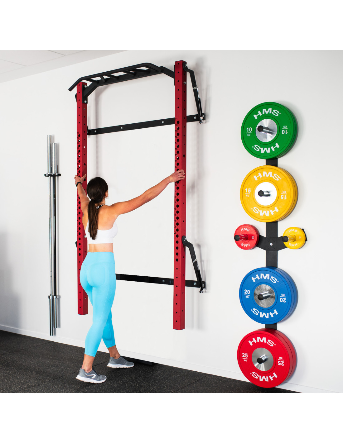 Wall Rack KLT23 wird für Stabilität und Sicherheit an der Wand befestigt. Wenn er nicht gebraucht wird, kann man ihn leicht zusammenklappen, so dass er nicht viel Platz beansprucht. Dies ist ein großer Vorteil dieses Geräts, da es auch von Personen mit begrenztem Trainingsraum verwendet werden kann. Wenn das Produkt an seiner tiefsten Stelle zusammengeklappt ist, nimmt er nur 31 cm von der Wand ein! KLT23 von der Marke HMS ist eine robuste Konstruktion, mit der Sie eine breite Palette von Übungen durchführen können.